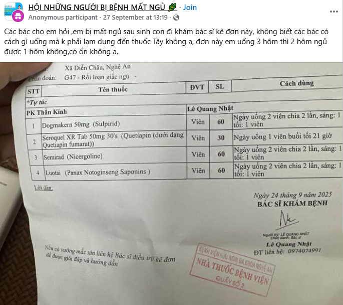 Các bác cho em hỏi ,em bị mất ngủ sau sinh con đi khám bác sĩ kê đơn này, không biết các bác có cách gì uống mà k phải lạm dụng đến thuốc Tây không ạ, đơn này em uống 3 hôm thì 2 hôm ngủ được 1 hôm không,có ổn không ạ. Link câu hỏi: https://www.facebook.com/groups/caythuocvietnam1102/posts/1773965433234693 Các bác cho em hỏi ,em bị mất ngủ sau sinh con đi khám bác sĩ kê đơn này, không biết các bác có cách gì uống mà k phải lạm dụng đến thuốc Tây không ạ, đơn này em uống 3 hôm thì 2 hôm ngủ được 1 hôm kh... Read more