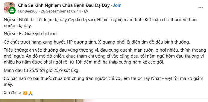 Nội soi Nhật: bs kết luận dạ dày đẹp ko bị sao, HP xét nghiệm âm tính. Kết luận cho thuốc về trào ngược dạ dày. Nội soi Bv Gia Định tp.hcm: Có chút trượt hang xung huyết, HP dương tính, X-quang phổi & điện tim đồ đều bình thường. Triệu chứng: ăn vào thường đau vùng thượng vị, đau xung quanh mạn sườn, ợ hơi nhiều, thỉnh thoảng nhói ngực. Ăn đồ mỡ đồ chiên, chua thậm chí uống cf vào cũng đau, tối nằm ngủ hôm đau thượng vị nhiều ko nằm được phải ngồi rồi từ 10h đêm mới hạ thấp xuống nằm kê cao gối. Mình đau từ 25/5 tới giờ 25/9 sút 8kg. Có bác nào có bài thuốc chữa bớt chứng trào ngược chỉ với, em thuốc Tây Nhật - việt rồi mà ko giảm mấy. Xin đa tạ ☺️🙏 Link câu hỏi: https://www.facebook.com/groups/kinhnghiemdieutribenhdaudaday/posts/24488687690815940/ Nội soi Nhật: bs kết luận dạ dày đẹp ko bị sao, HP xét nghiệm âm tính. Kết luận cho thuốc về trào ngược dạ dày. Nội soi Bv Gia Định tp.hcm: Có chút trượt hang xung huyết, HP dương tính, X-quang phổi... Read more