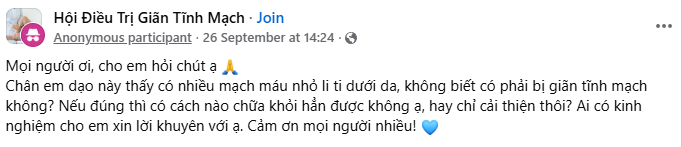 Mọi người ơi, cho em hỏi chút ạ 🙏 Chân em dạo này thấy có nhiều mạch máu nhỏ li ti dưới da, không biết có phải bị giãn tĩnh mạch không? Nếu đúng thì có cách nào chữa khỏi hẳn được không ạ, hay chỉ cải thiện thôi? Ai có kinh nghiệm cho em xin lời khuyên với ạ. Cảm ơn mọi người nhiều! 💙 Link câu hỏi: https://www.facebook.com/groups/299288719837423/posts/706350809131210 Mọi người ơi, cho em hỏi chút ạ 🙏 Chân em dạo này thấy có nhiều mạch máu nhỏ li ti dưới da, không biết có phải bị giãn tĩnh mạch không? Nếu đúng thì có cách nào chữa khỏi hẳn được không ạ, hay chỉ c... Read more