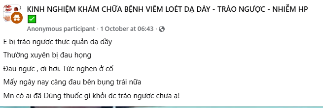 E bị trào ngược thực quản dạ dầy Thường xuyên bị đau họng Đau ngực , ợ hơi. Tức nghẹn ở cổ Mấy ngày nay càng đau bên bụng trái nữa Mn có ai đã Dùng thuốc gì khỏi dc trào ngược chưa ạ! Link câu hỏi: https://www.facebook.com/groups/chuaviemloetdaday/posts/24448427871492629 E bị trào ngược thực quản dạ dầy Thường xuyên bị đau họng Đau ngực , ợ hơi. Tức nghẹn ở cổ Mấy ngày nay càng đau bên bụng trái nữa Mn có ai đã Dùng thuốc gì khỏi dc trào ngược chưa ạ! Link câu... Read more