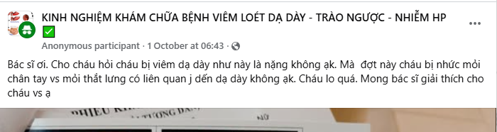 Bác sĩ ơi. Cho cháu hỏi cháu bị viêm dạ dày như này là nặng không ạk. Mà đợt này cháu bị nhức mỏi chân tay vs mỏi thắt lưng có liên quan j dến dạ dày không ạk. Cháu lo quá. Mong bác sĩ giải thích cho cháu vs ạ Link câu hỏi: https://www.facebook.com/groups/chuaviemloetdaday/posts/24448387054830044/ Bác sĩ ơi. Cho cháu hỏi cháu bị viêm dạ dày như này là nặng không ạk. Mà đợt này cháu bị nhức mỏi chân tay vs mỏi thắt lưng có liên quan j dến dạ dày không ạk. Cháu lo quá. Mong bác sĩ giải thích cho... Read more