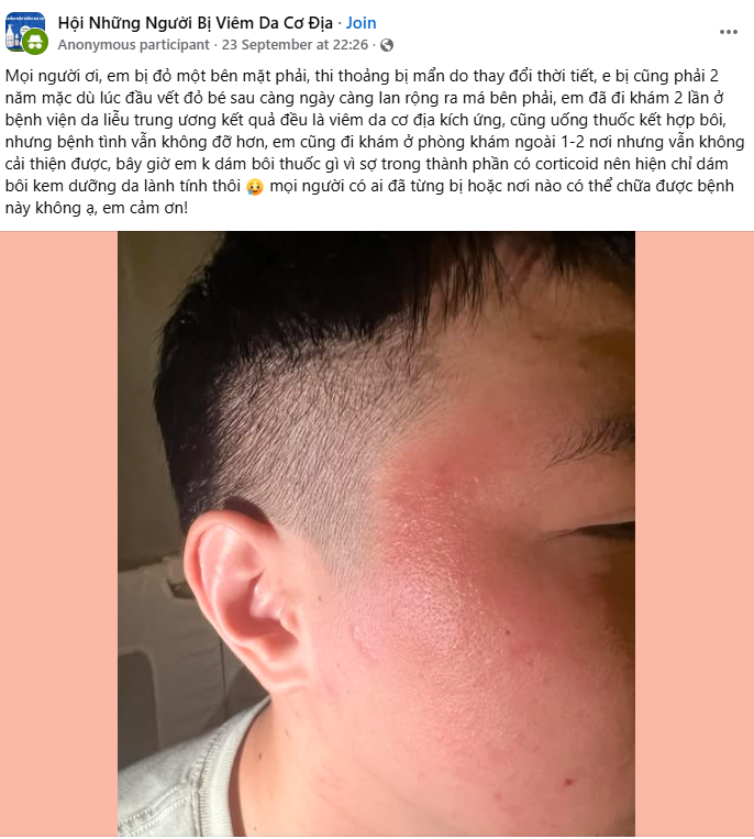 Mọi người ơi, em bị đỏ một bên mặt phải, thi thoảng bị mẩn do thay đổi thời tiết, e bị cũng phải 2 năm mặc dù lúc đầu vết đỏ bé sau càng ngày càng lan rộng ra má bên phải, em đã đi khám 2 lần ở bệnh viện da liễu trung ương kết quả đều là viêm da cơ địa kích ứng, cũng uống thuốc kết hợp bôi, nhưng bệnh tình vẫn không đỡ hơn, em cũng đi khám ở phòng khám ngoài 1-2 nơi nhưng vẫn không cải thiện được, bây giờ em k dám bôi thuốc gì vì sợ trong thành phần có corticoid nên hiện chỉ dám bôi kem dưỡng da lành tính thôi 🥲 mọi người có ai đã từng bị hoặc nơi nào có thể chữa được bệnh này không ạ, em cảm ơn! Link câu hỏi: https://www.facebook.com/groups/hoiviemdacodia/posts/1844009962892020/ Mọi người ơi, em bị đỏ một bên mặt phải, thi thoảng bị mẩn do thay đổi thời tiết, e bị cũng phải 2 năm mặc dù lúc đầu vết đỏ bé sau càng ngày càng lan rộng ra má bên phải, em đã đi khám 2 lần ở bệnh v... Read more