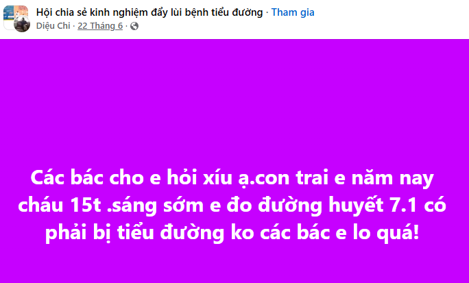 Các bác cho e hỏi xíu ạ.con trai e năm nay cháu 15t .sáng sớm e đo đường huyết 7.1 có phải bị tiểu đường ko các bác e lo quá! Link câu hỏi: https://www.facebook.com/share/p/17PDHTDGoH/ Các bác cho e hỏi xíu ạ.con trai e năm nay cháu 15t .sáng sớm e đo đường huyết 7.1 có phải bị tiểu đường ko các bác e lo quá! Link câu hỏi: https://www.facebook.com/share/p/17PDHTDGoH/ Read more