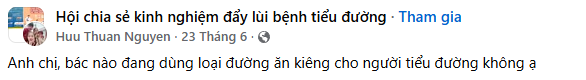 Anh chị, bác nào đang dùng loại đường ăn kiêng cho người tiểu đường không ạ Link câu hỏi: https://www.facebook.com/share/p/1E5VkHGbfK/ Anh chị, bác nào đang dùng loại đường ăn kiêng cho người tiểu đường không ạ Link câu hỏi: https://www.facebook.com/share/p/1E5VkHGbfK/