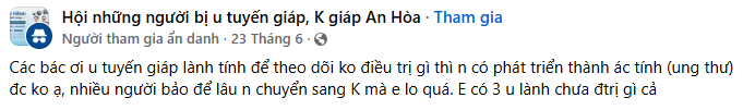 Các bác ơi u tuyến giáp lành tính để theo dõi ko điều trị gì thì n có phát triển thành ác tính (ung thư) đc ko ạ, nhiều người bảo để lâu n chuyển sang K mà e lo quá. E có 3 u lành chưa đtrị gì cả Link câu hỏi: https://www.facebook.com/share/p/1Ap2dqeNpD/?mibextid=wwXIfr Các bác ơi u tuyến giáp lành tính để theo dõi ko điều trị gì thì n có phát triển thành ác tính (ung thư) đc ko ạ, nhiều người bảo để lâu n chuyển sang K mà e lo quá. E có 3 u lành chưa đtrị gì cả L... Read more
