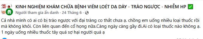 Cả nhà mình có ai có bị trào ngược với đại tràng co thắt chưa ạ. chồng em uống nhiều loại thuốc rồi mà không khỏi. Còn liên quan đến cổ họng nữa.Càng ngày càng gầy đi.Ai có loại thuốc nào không ạ. 1 ngày uống nhiều thuốc tây quá sợ hại người quá ạ Link câu hỏi: https://www.facebook.com/share/p/1AtERAZrBD/ Cả nhà mình có ai có bị trào ngược với đại tràng co thắt chưa ạ. chồng em uống nhiều loại thuốc rồi mà không khỏi. Còn liên quan đến cổ họng nữa.Càng ngày càng gầy đi.Ai có loại thuốc nào không ạ. 1 n... Read more