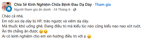 Em nội soi dạ dày bị HP, trào ngược và viêm dạ dày. Mà thuốc khó uống ghê. Đang điều trị mà kiểu lúc nào cũng kiểu nao nao xót ruột. Ăn thì chẳng ăn được 😔😔 Ai có kinh nghiệm cho em xin hướng điều trị với ạ 😔 Link câu hỏi: https://www.facebook.com/share/p/1EsdwdCVHa/ Em nội soi dạ dày bị HP, trào ngược và viêm dạ dày. Mà thuốc khó uống ghê. Đang điều trị mà kiểu lúc nào cũng kiểu nao nao xót ruột. Ăn thì chẳng ăn được 😔😔 Ai có kinh nghiệm cho em xin hướng... Read more
