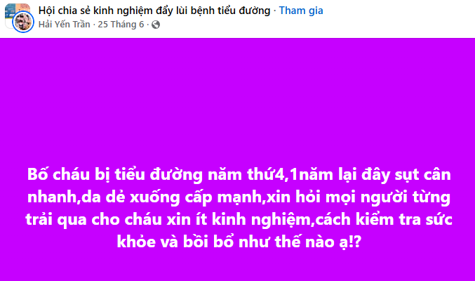 Bố cháu bị tiểu đường năm thứ 4, 1năm lại đây sụt cân nhanh, da dẻ xuống cấp mạnh, xin hỏi mọi người từng trải qua cho cháu xin ít kinh nghiệm, cách kiểm tra sức khỏe và bồi bổ như thế nào ạ!? Link câu hỏi: https://www.facebook.com/share/p/1AuXu9fvC5/ Bố cháu bị tiểu đường năm thứ 4, 1năm lại đây sụt cân nhanh, da dẻ xuống cấp mạnh, xin hỏi mọi người từng trải qua cho cháu xin ít kinh nghiệm, cách kiểm tra sức khỏe và bồi bổ như thế nào ạ!? Link... Read more