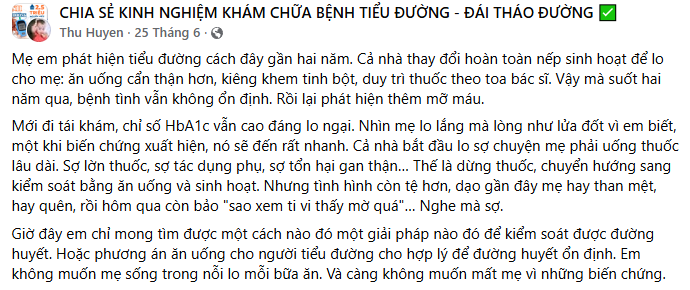 Mẹ em phát hiện tiểu đường cách đây gần hai năm. Cả nhà thay đổi hoàn toàn nếp sinh hoạt để lo cho mẹ: ăn uống cẩn thận hơn, kiêng khem tinh bột, duy trì thuốc theo toa bác sĩ. Vậy mà suốt hai năm qua, bệnh tình vẫn không ổn định. Rồi lại phát hiện thêm mỡ máu. Mới đi tái khám, chỉ số HbA1c vẫn cao đáng lo ngại. Nhìn mẹ lo lắng mà lòng như lửa đốt vì em biết, một khi biến chứng xuất hiện, nó sẽ đến rất nhanh. Cả nhà bắt đầu lo sợ chuyện mẹ phải uống thuốc lâu dài. Sợ lờn thuốc, sợ tác dụng phụ, sợ tổn hại gan thận… Thế là dừng thuốc, chuyển hướng sang kiểm soát bằng ăn uống và sinh hoạt. Nhưng tình hình còn tệ hơn, dạo gần đây mẹ hay than mệt, hay quên, rồi hôm qua còn bảo "sao xem ti vi thấy mờ quá"… Nghe mà sợ. Giờ đây em chỉ mong tìm được một cách nào đó một giải pháp nào đó để kiểm soát được đường huyết. Hoặc phương án ăn uống cho người tiểu đường cho hợp lý để đường huyết ổn định. Em không muốn mẹ sống trong nỗi lo mỗi bữa ăn. Và càng không muốn mất mẹ vì những biến chứng. Link câu hỏi: https://www.facebook.com/share/p/16neySjXj3/ Mẹ em phát hiện tiểu đường cách đây gần hai năm. Cả nhà thay đổi hoàn toàn nếp sinh hoạt để lo cho mẹ: ăn uống cẩn thận hơn, kiêng khem tinh bột, duy trì thuốc theo toa bác sĩ. Vậy mà suốt hai năm qua... Read more