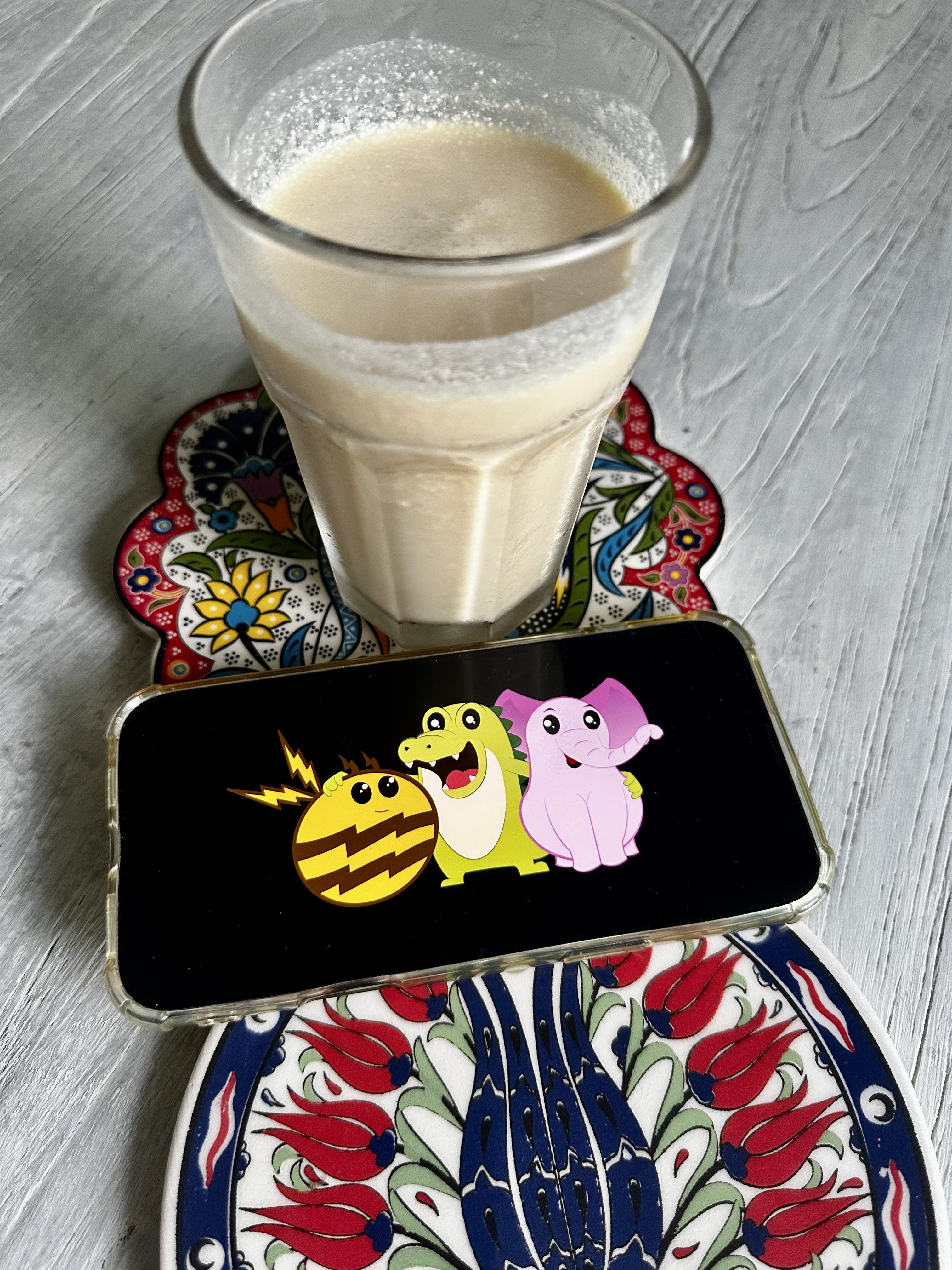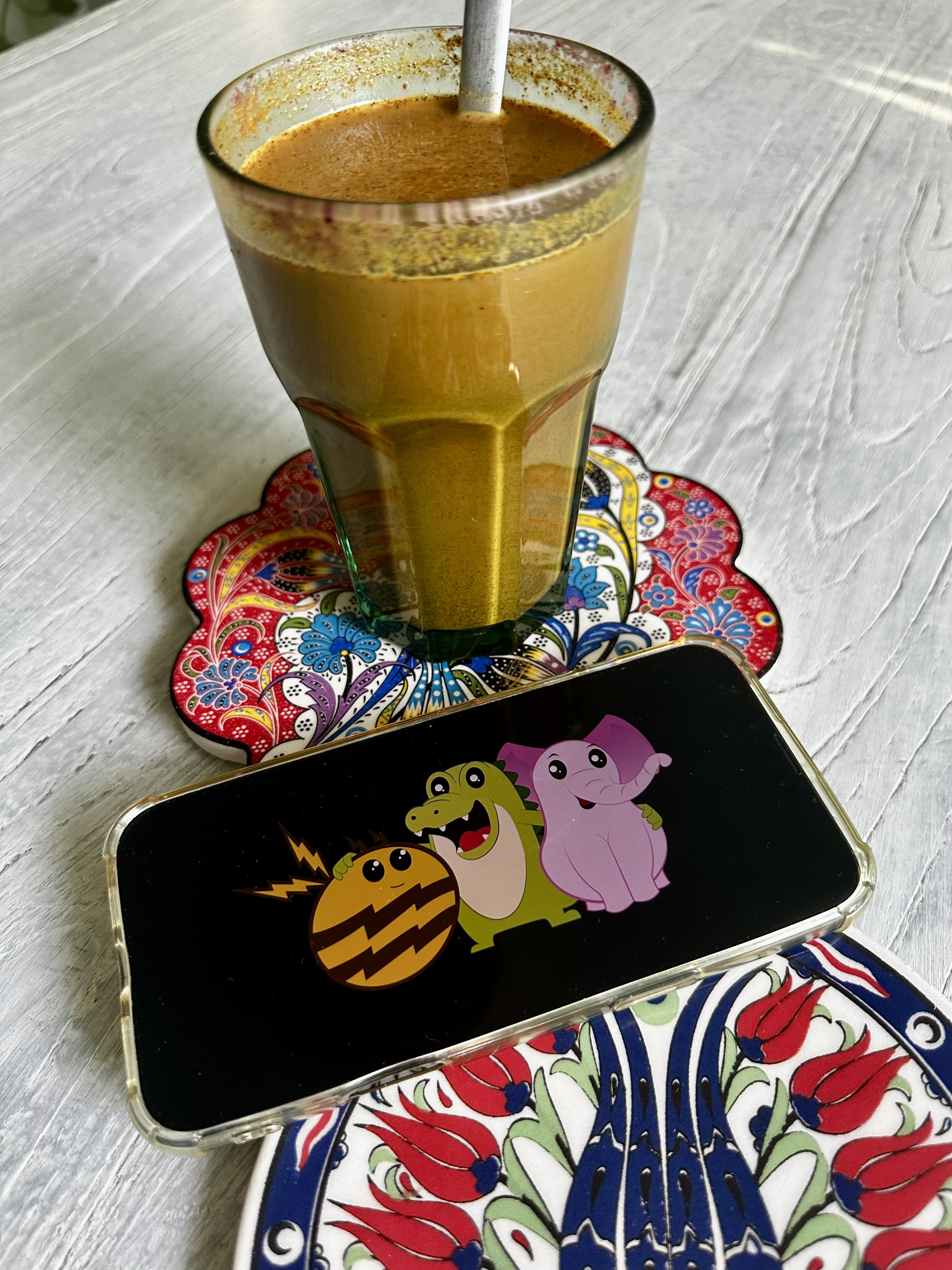 2) Decaffeinated coffee with turmeric, cinnamon, nutmeg, cacao, honey, cayenne pepper, smoked paprika, bee pollen, allspice, coriander, NO SUGAR ADDED