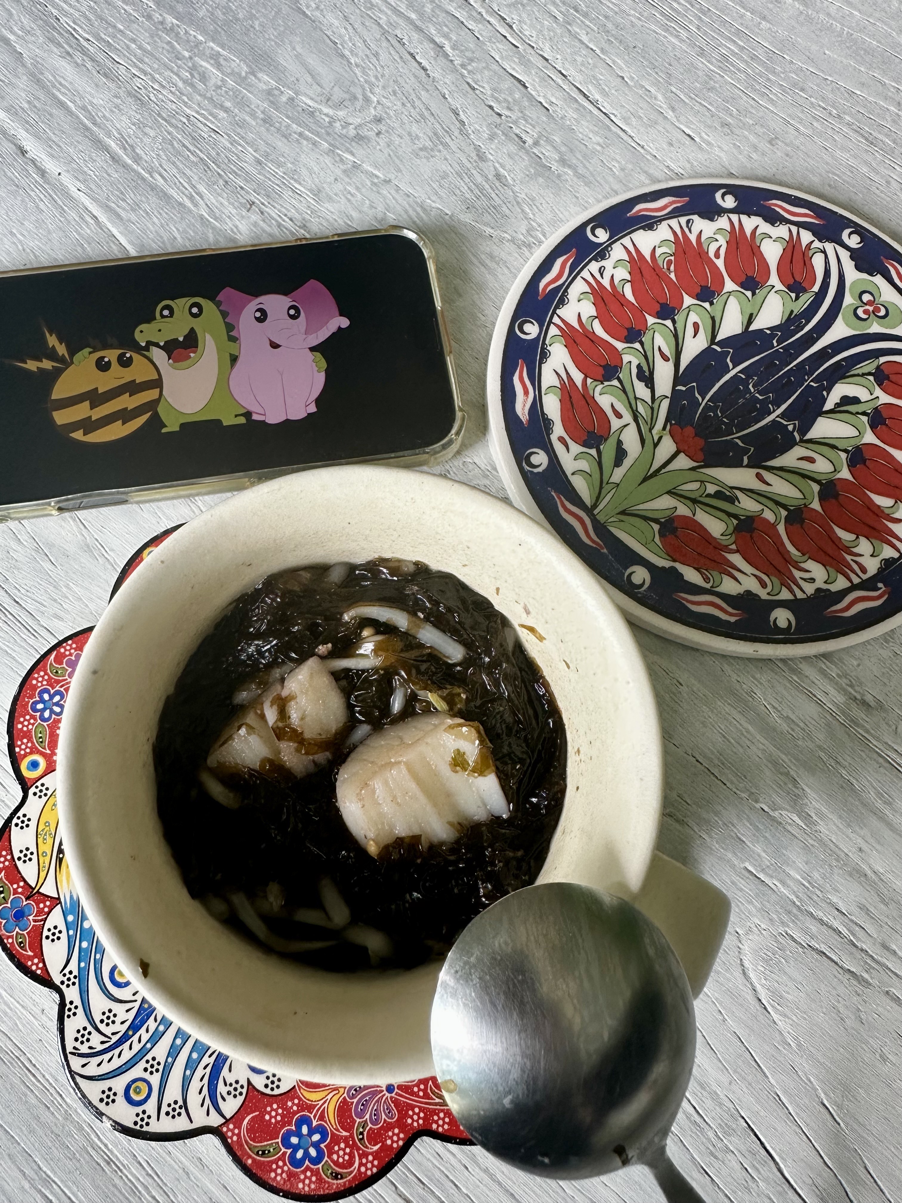 1) Pork soup with ginseng, seaweed, tomato, bean sprouts, Hokkaido scallops, Pandan leaf, coriander, smoked paprika, oysters, corn, NO SALT OR MSG OR SEASONING ADDED