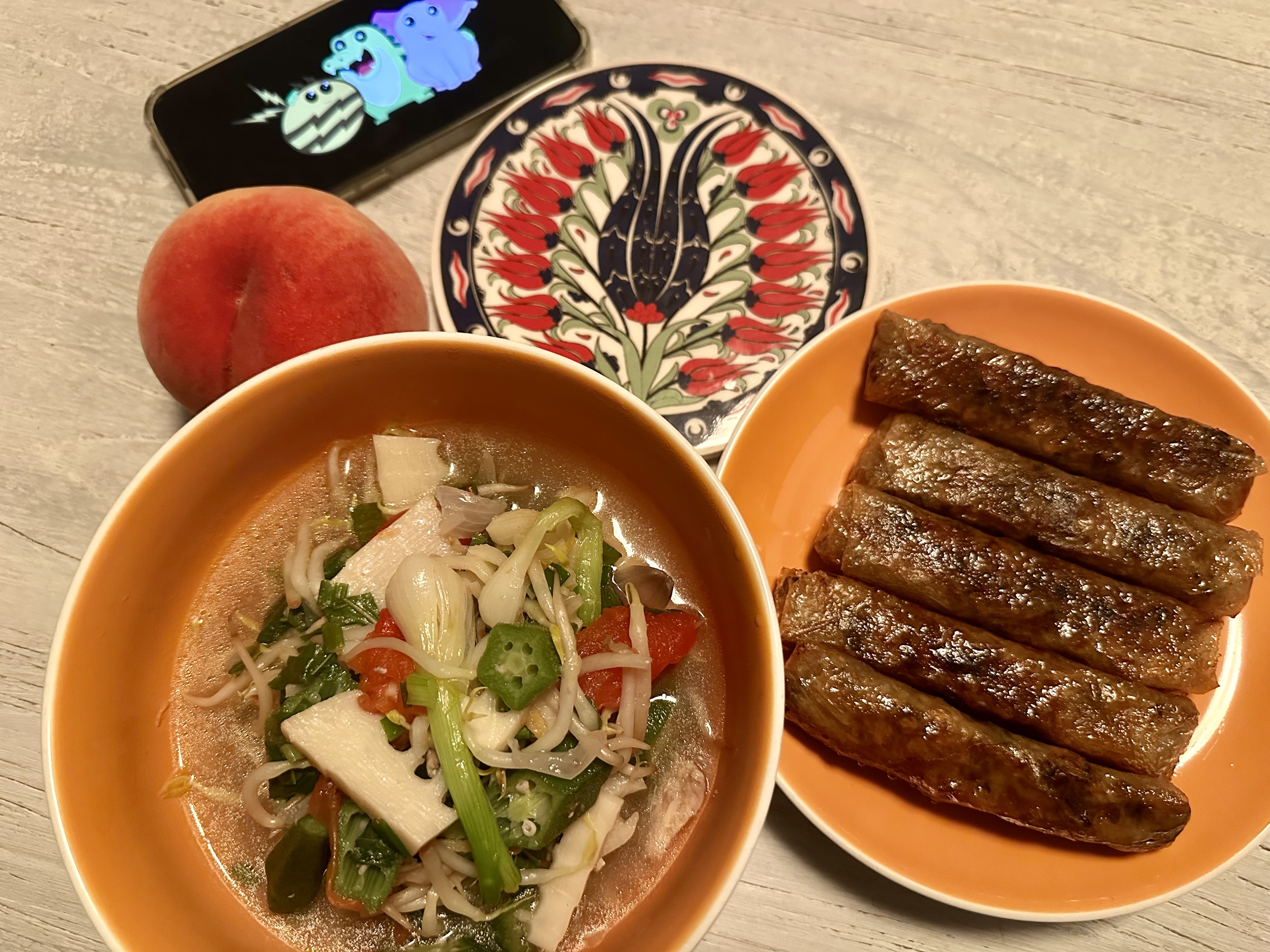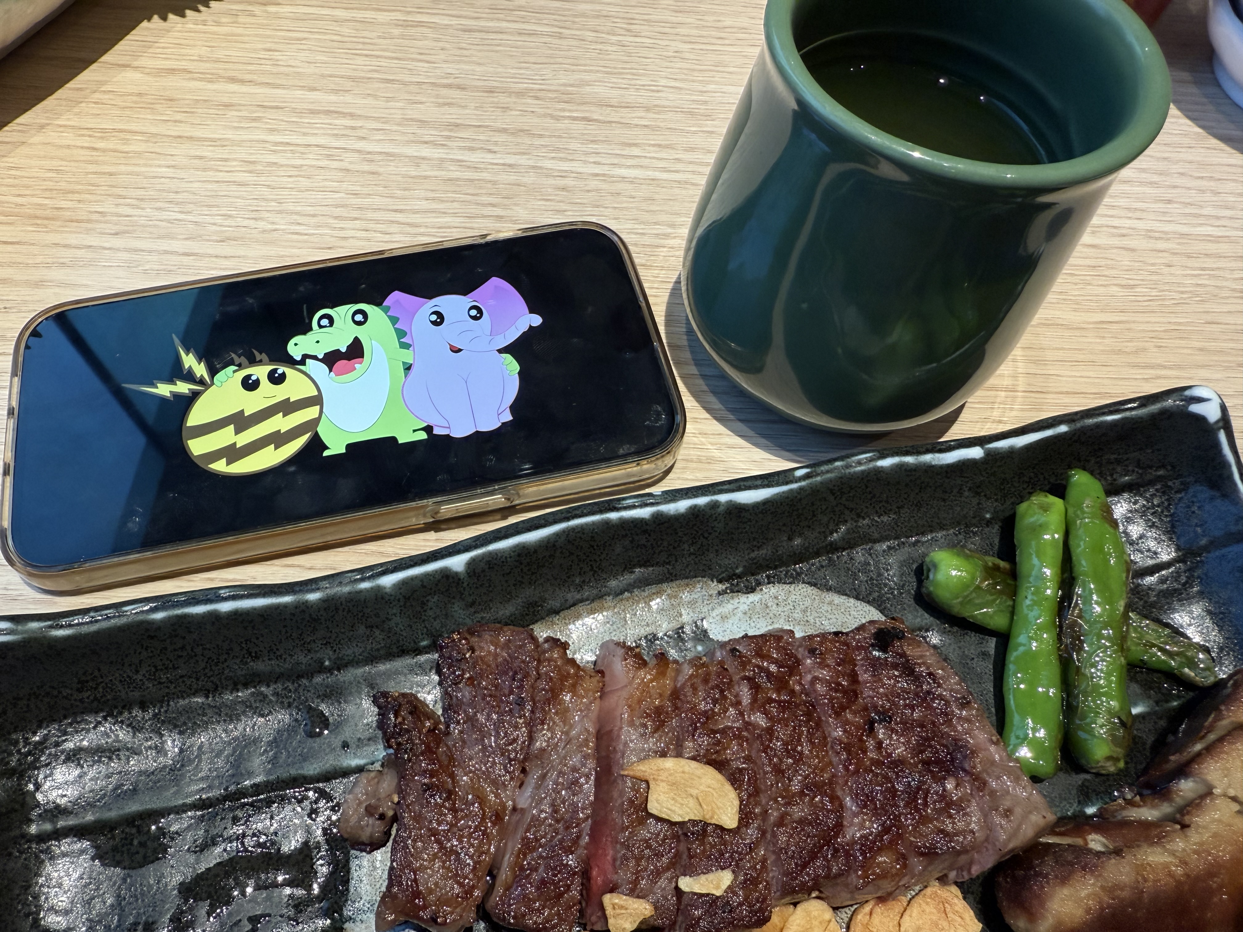 1) Ate out at a Japanese restaurant and ordered pan fried A4 Iwate Wagyu strip loin steak with Japanese peppers, NO SAUCE, and duck liver, accompanied with hot green tea