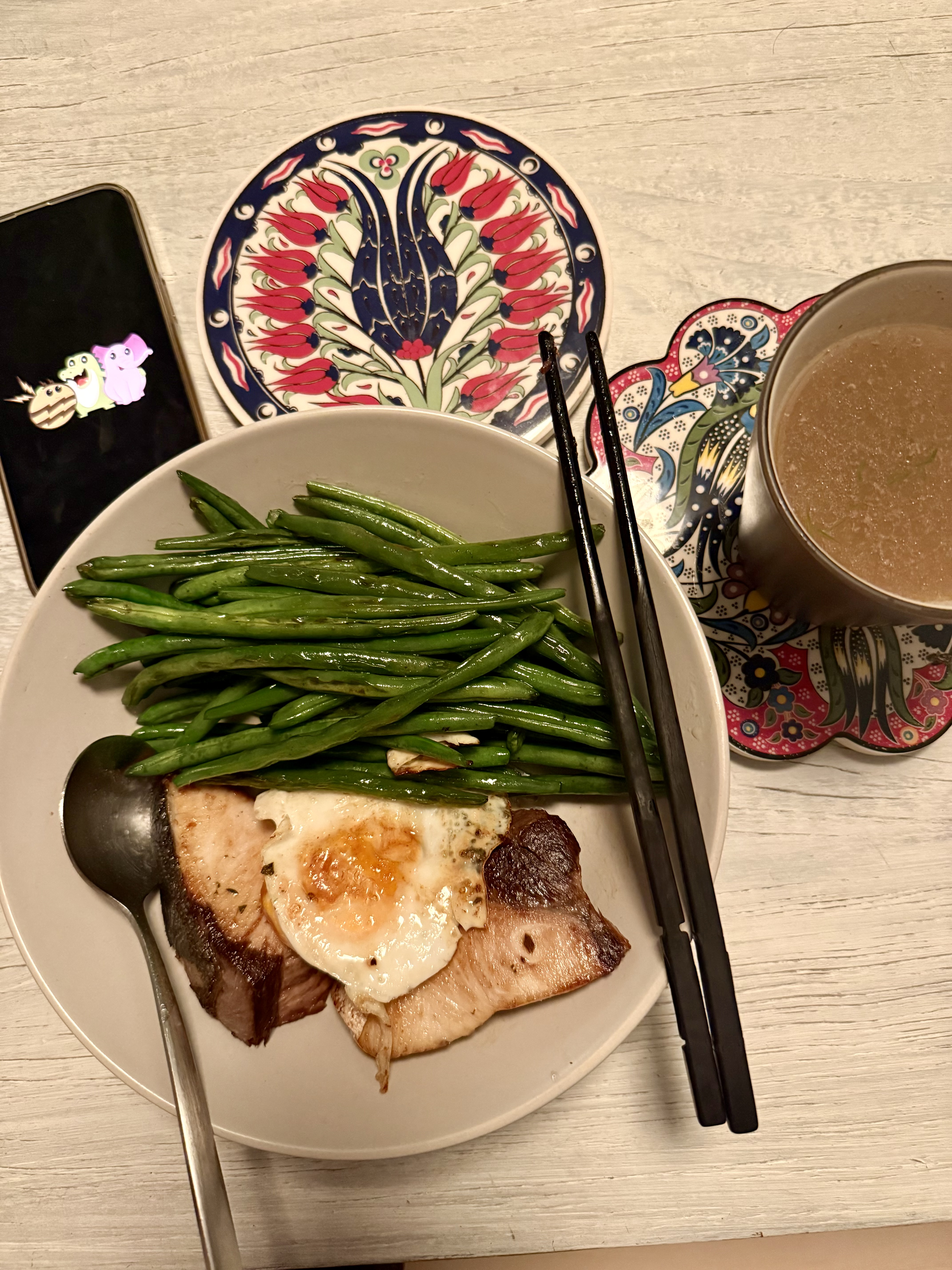 1) Wild caught Sword fish, Vietnamese hometown chicken egg and Long beans pan fried in lard, NO SALT OR MSG OR SEASONING ADDED
