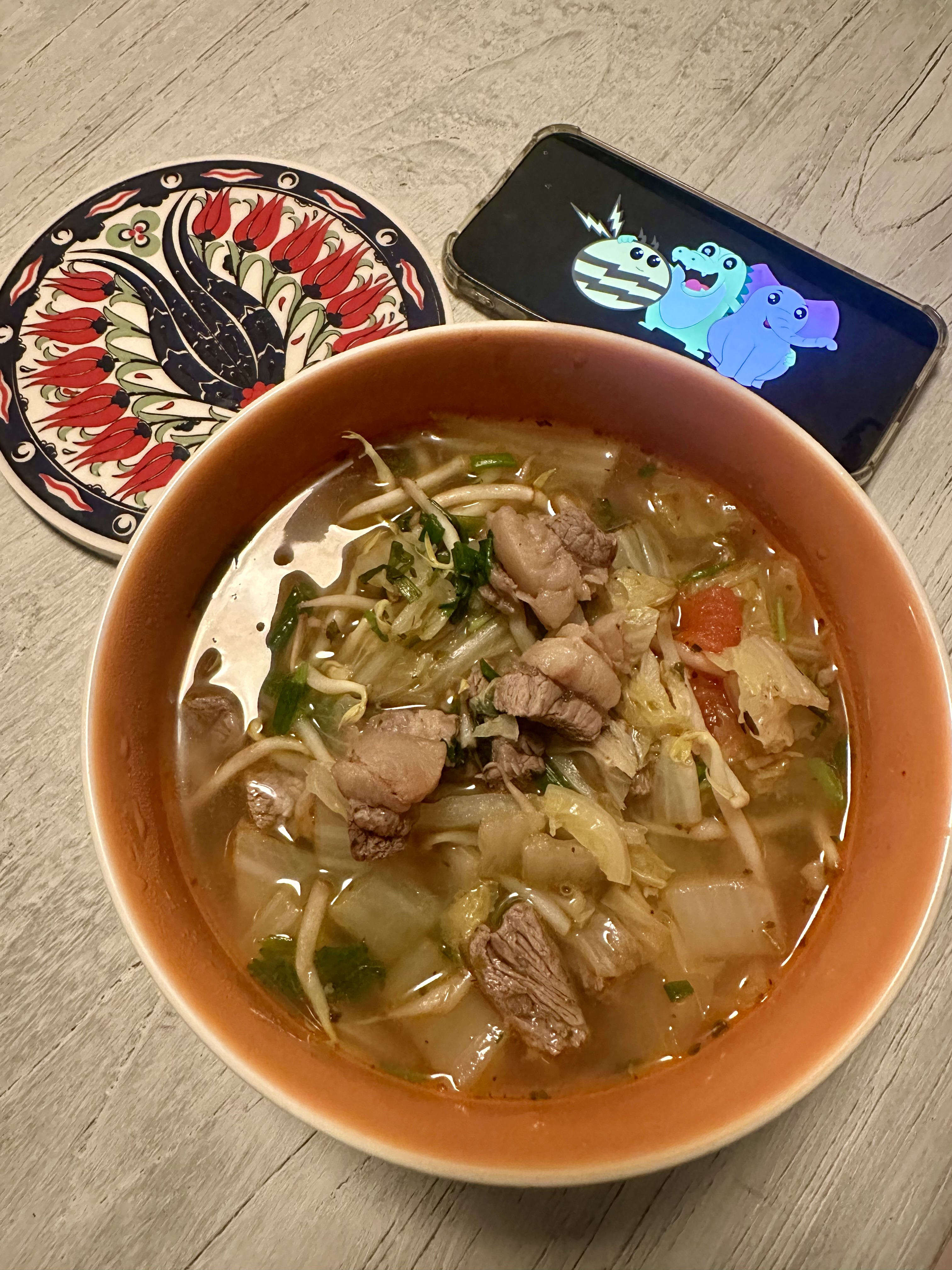 1) Beef soup with beef fat, Japanese Hokusai cabbage, bean sprouts, tomatoes, spring onions, thyme, sage, oregano, parsley, NO SALT OR MSG OR SEASONING ADDED