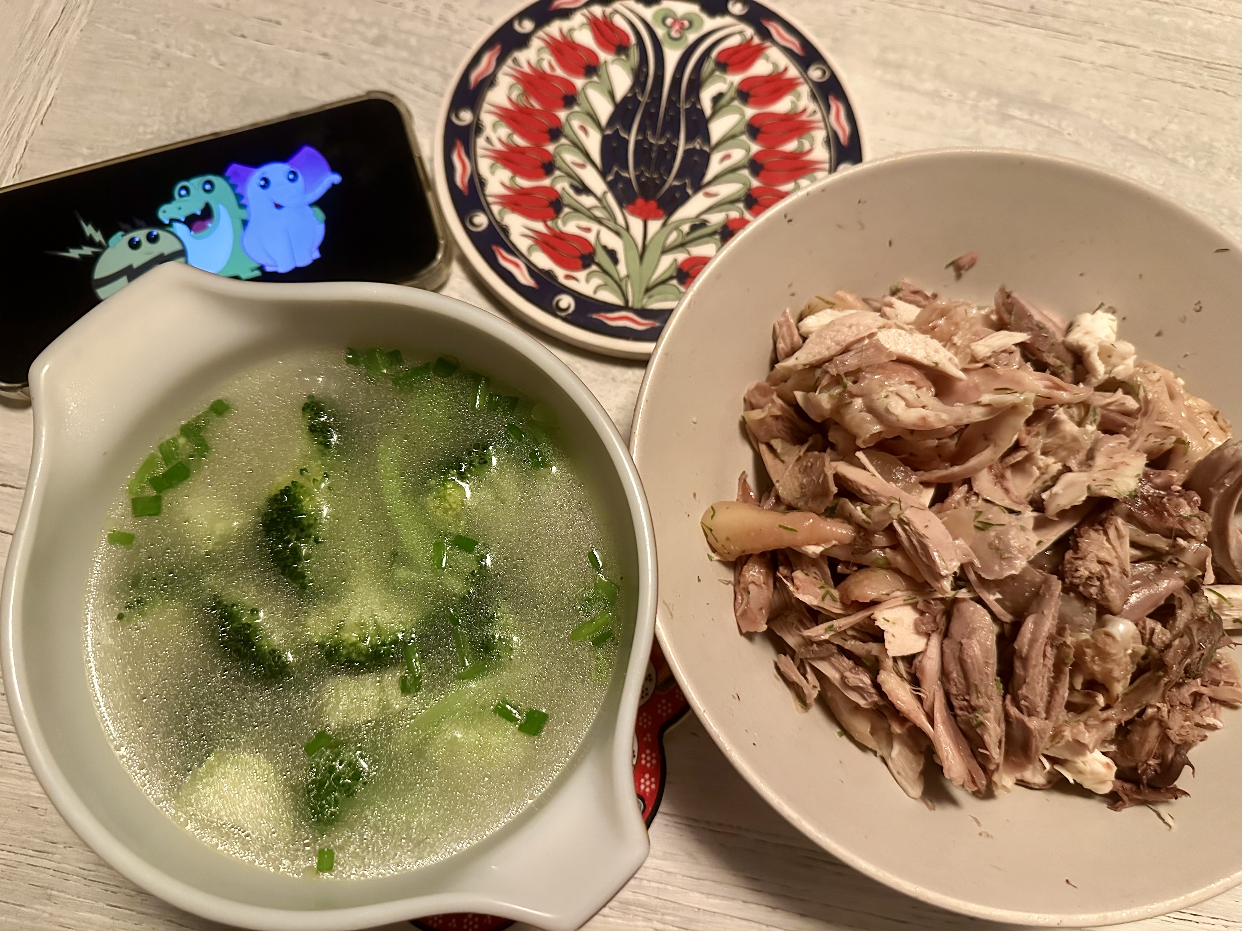 1) Vietnamese home town chicken soup with skin boiled with broccoli, spring onion, winter melon, NO SALT OR MSG OR SEASONING ADDED