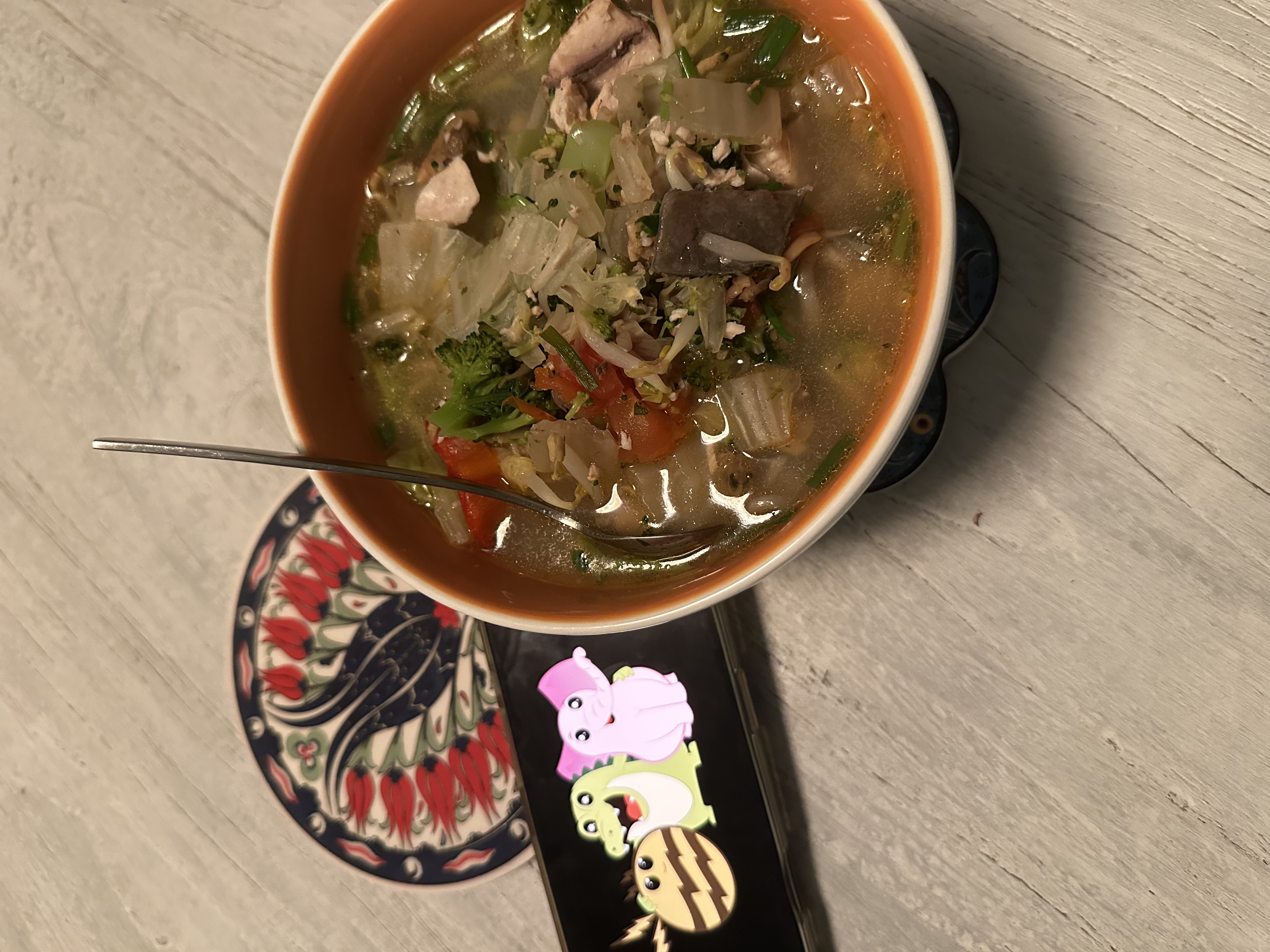 1) Pork soft bone broth boiled with prawn head, grass fed beef liver, beef pancreas, beef spleen, beef heart, beef kidney, Hokkaido scallops, broccoli, Japanese Hokusai, tomatoes, red bell peppers, Vietnamese home town duck egg, basil, parsley, sage, thyme, NO SALT OR MSG OR SEASONING ADDED