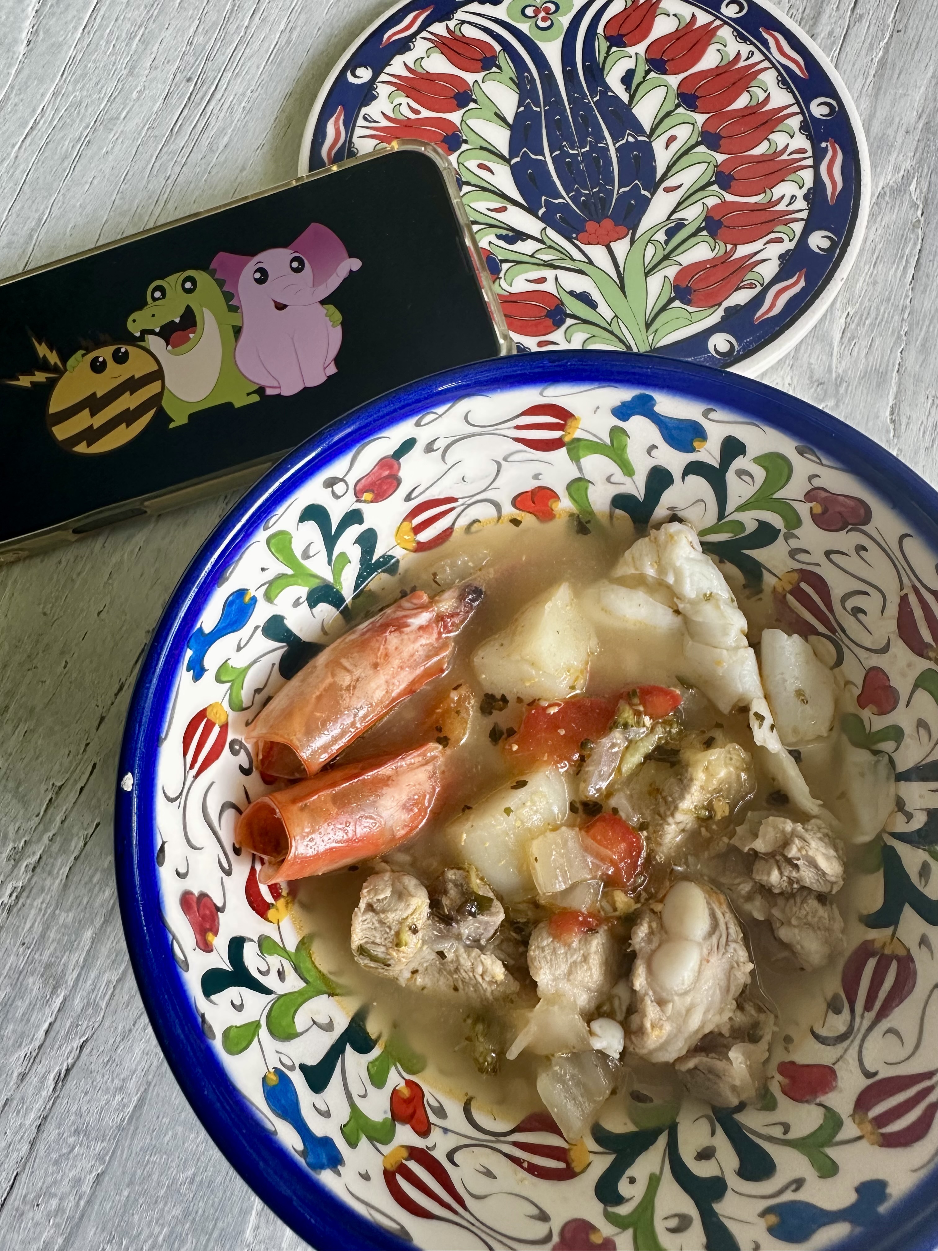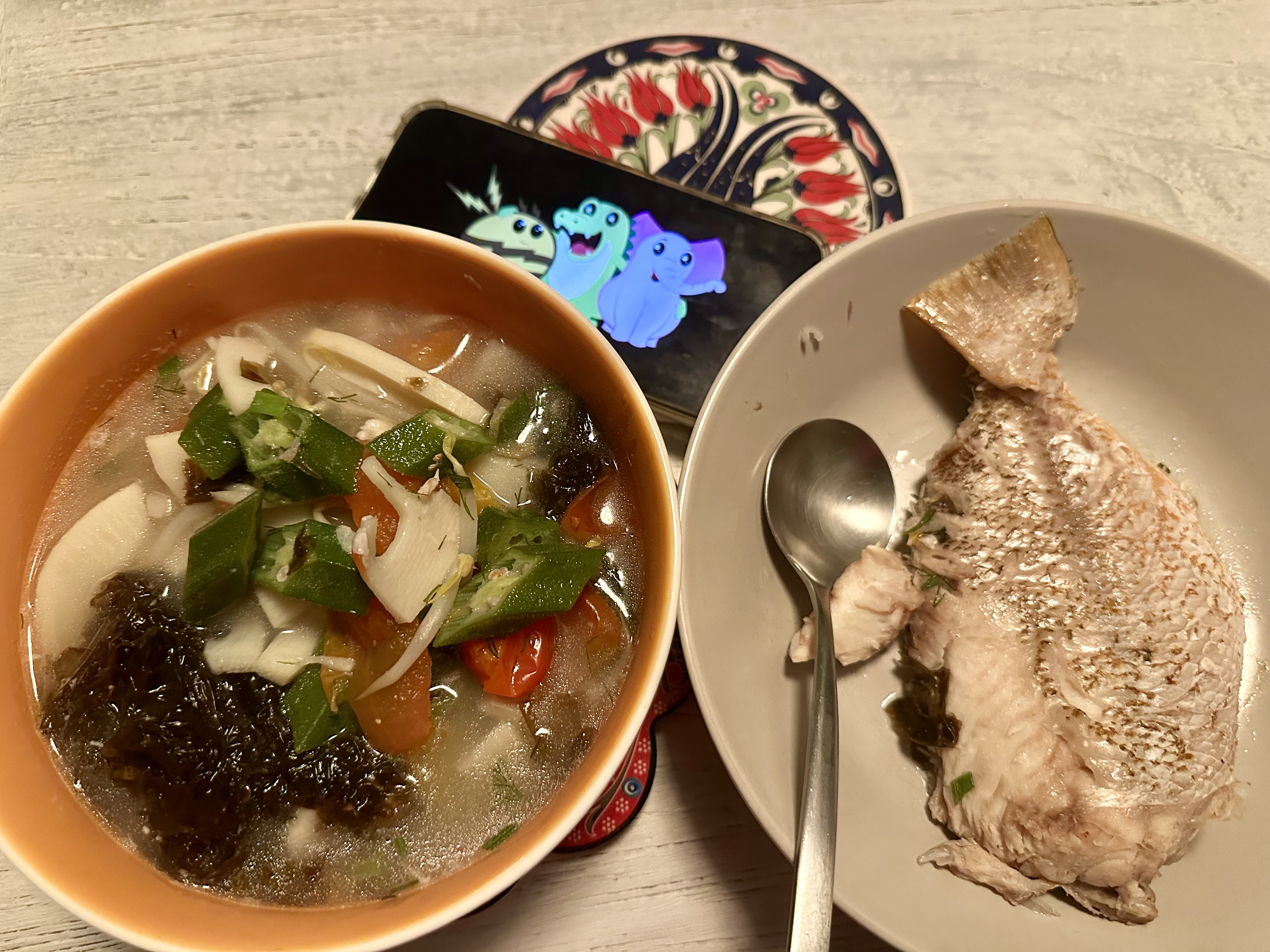1) Red snapper farm raised boiled with dill, laksa leaves, lady fingers, tomatoes, bean sprouts, seaweed, bamboo shoots, NO SALT OR MSG OR SEASONING ADDED