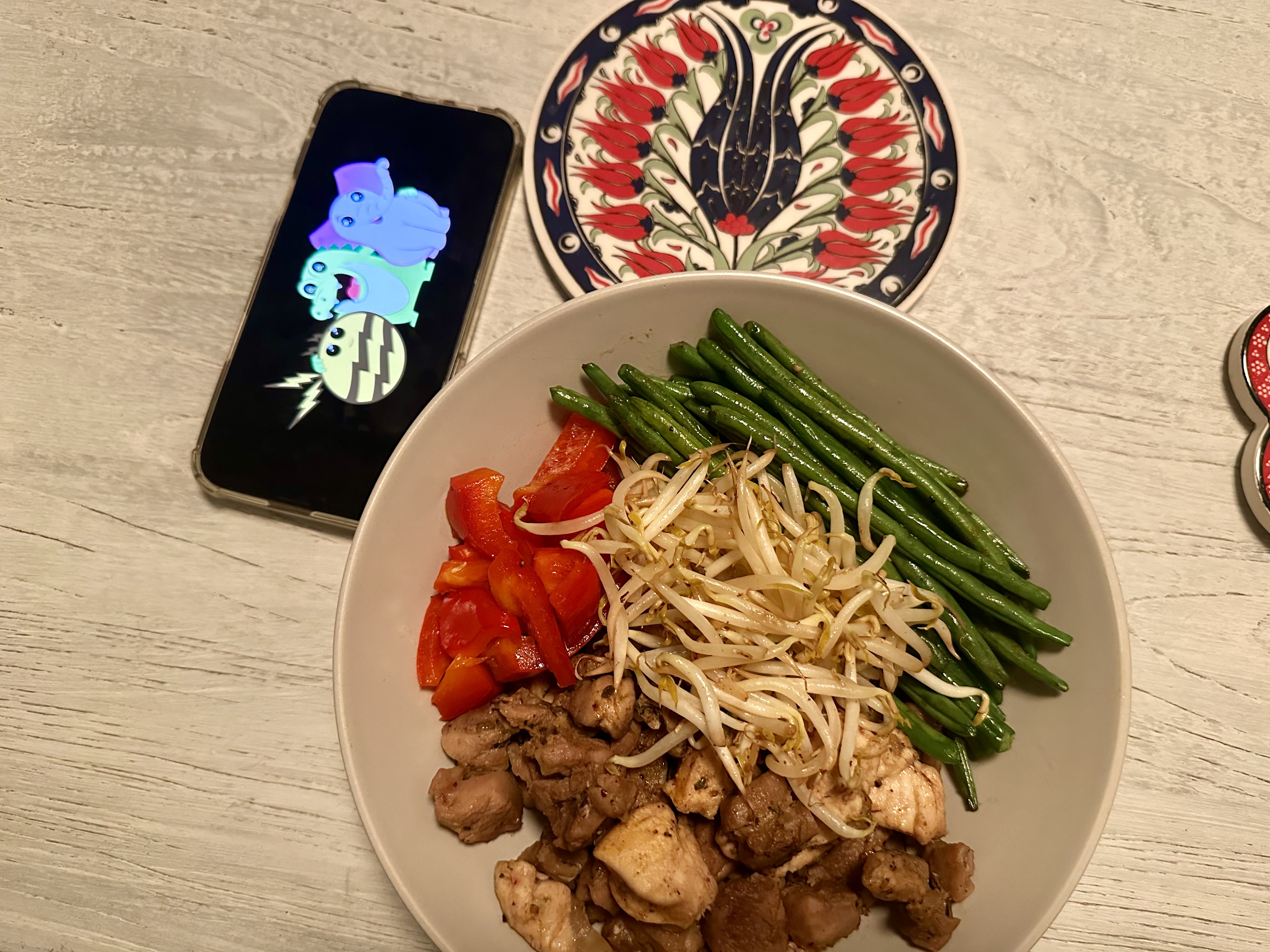 1) Vietnamese home town chicken with skin marinated in garam masala (comprising of coriander, cumin, black pepper, cardamom, clove, cinnamon, mace, bay leaves, fennel), paired with long beans, bean sprouts, bell red peppers all pan fried in lard, NO SALT OR MSG OR SEASONING ADDED