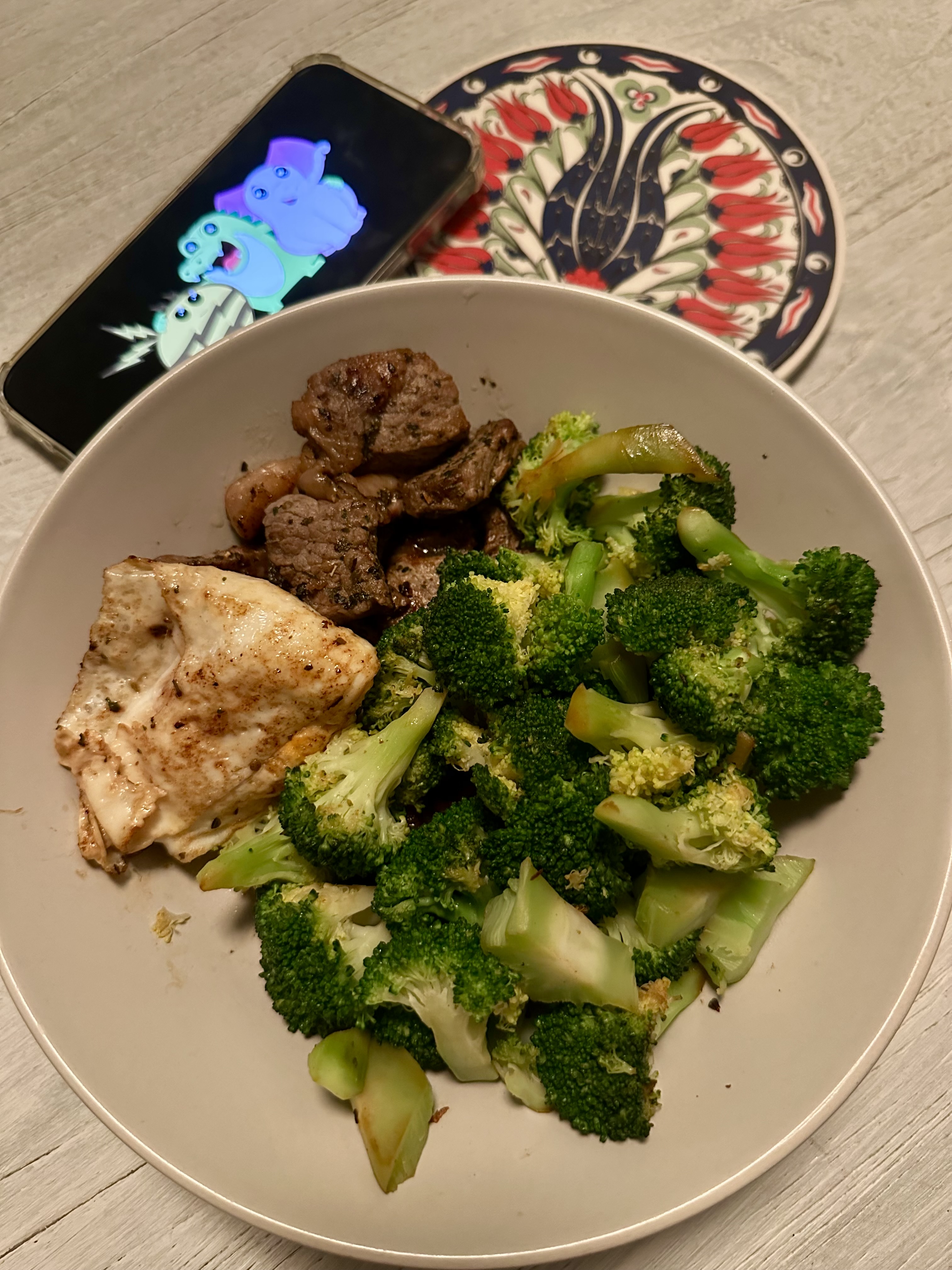 1) Australian Beef with fat marinated in tarragon, basil, oregano, sage, thyme with broccoli and Vietnamese home town duck egg all pan fried in lard, NO SALT OR MSG OR SEASONING ADDED