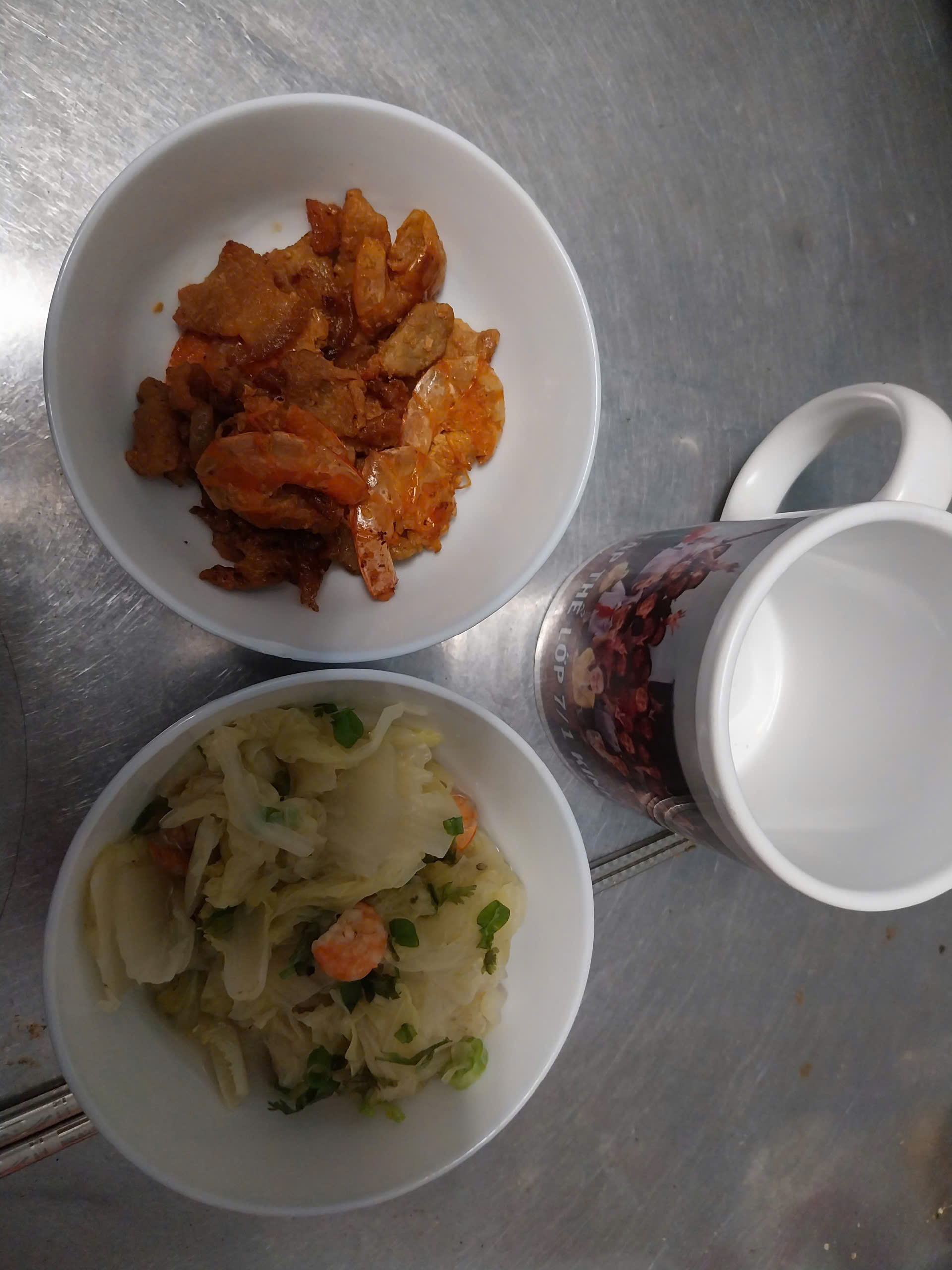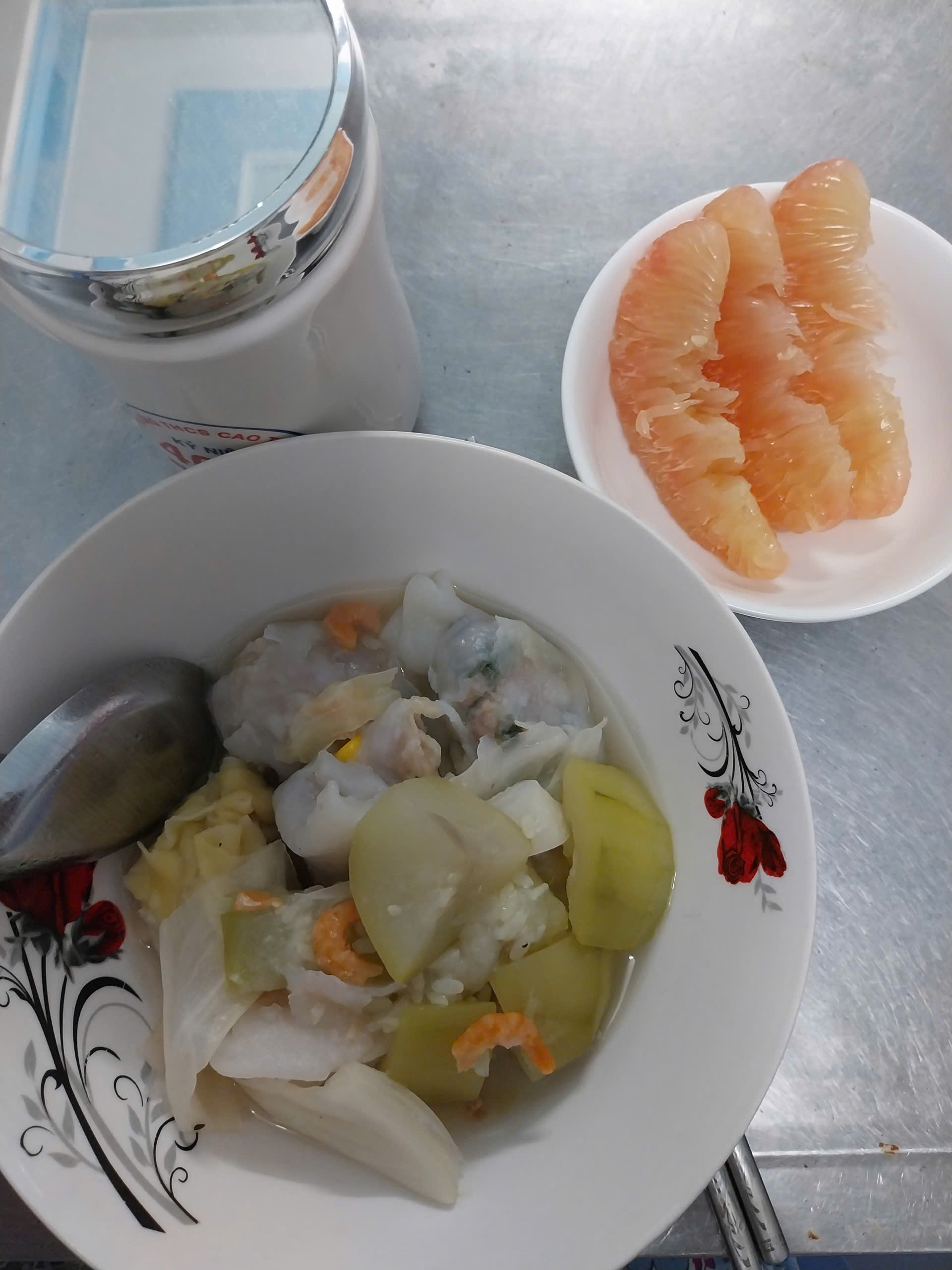 1) Canh bầu và bắp cải với tôm khô và há cảo, hoành thánh.