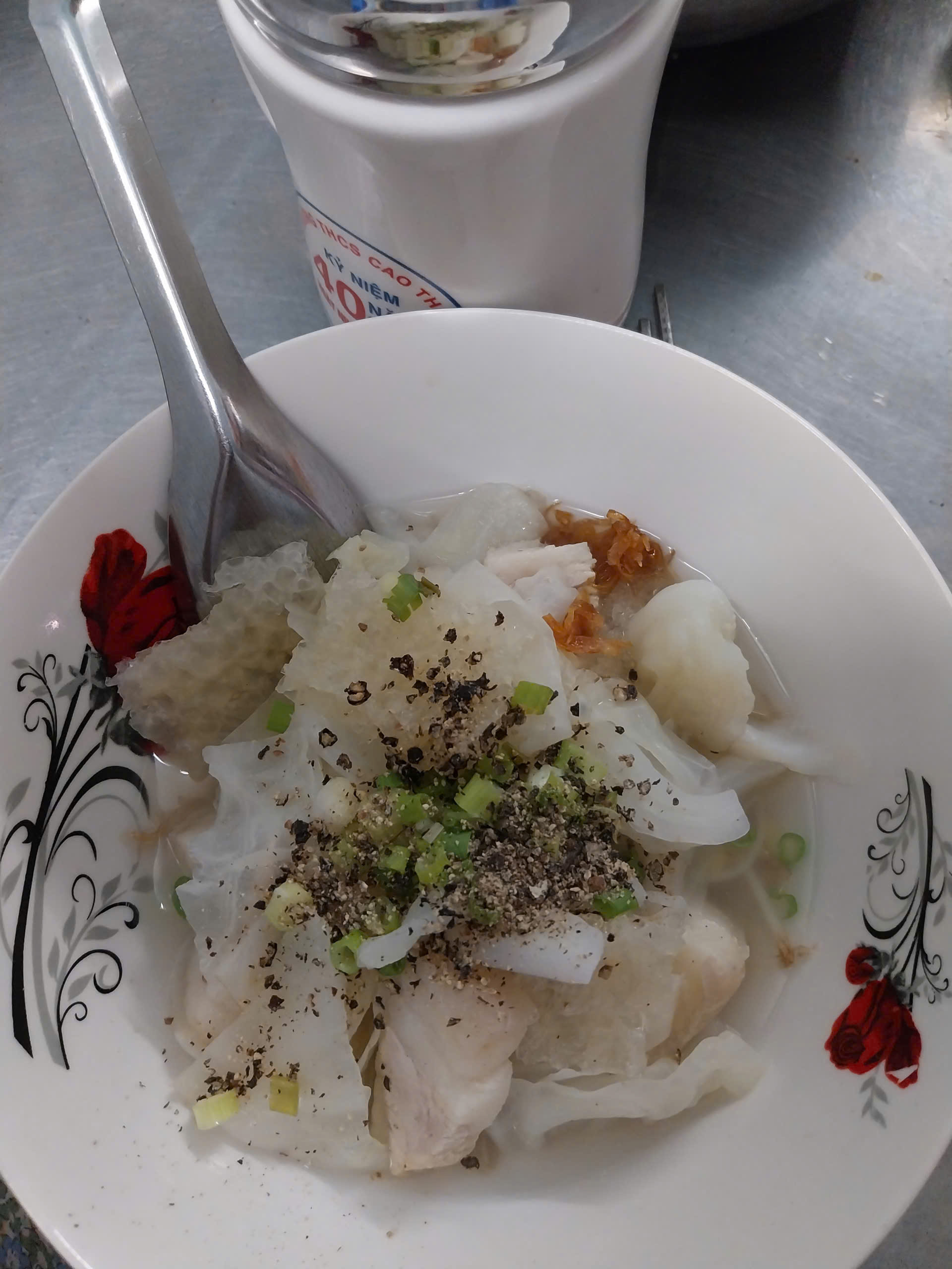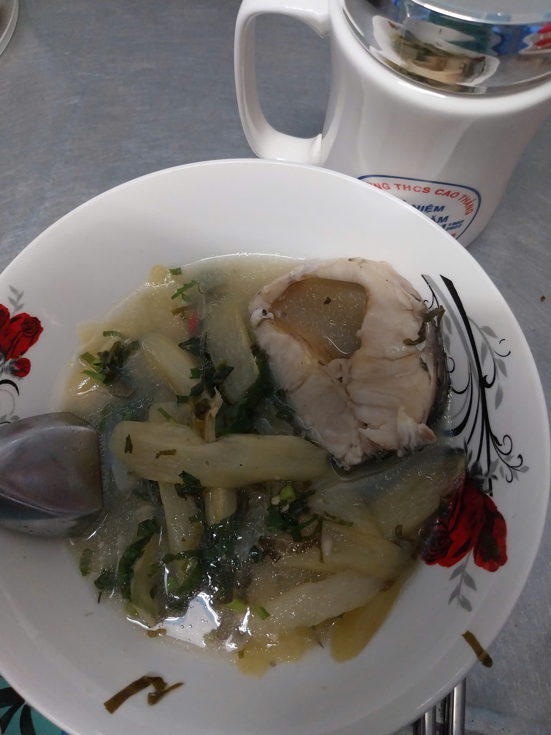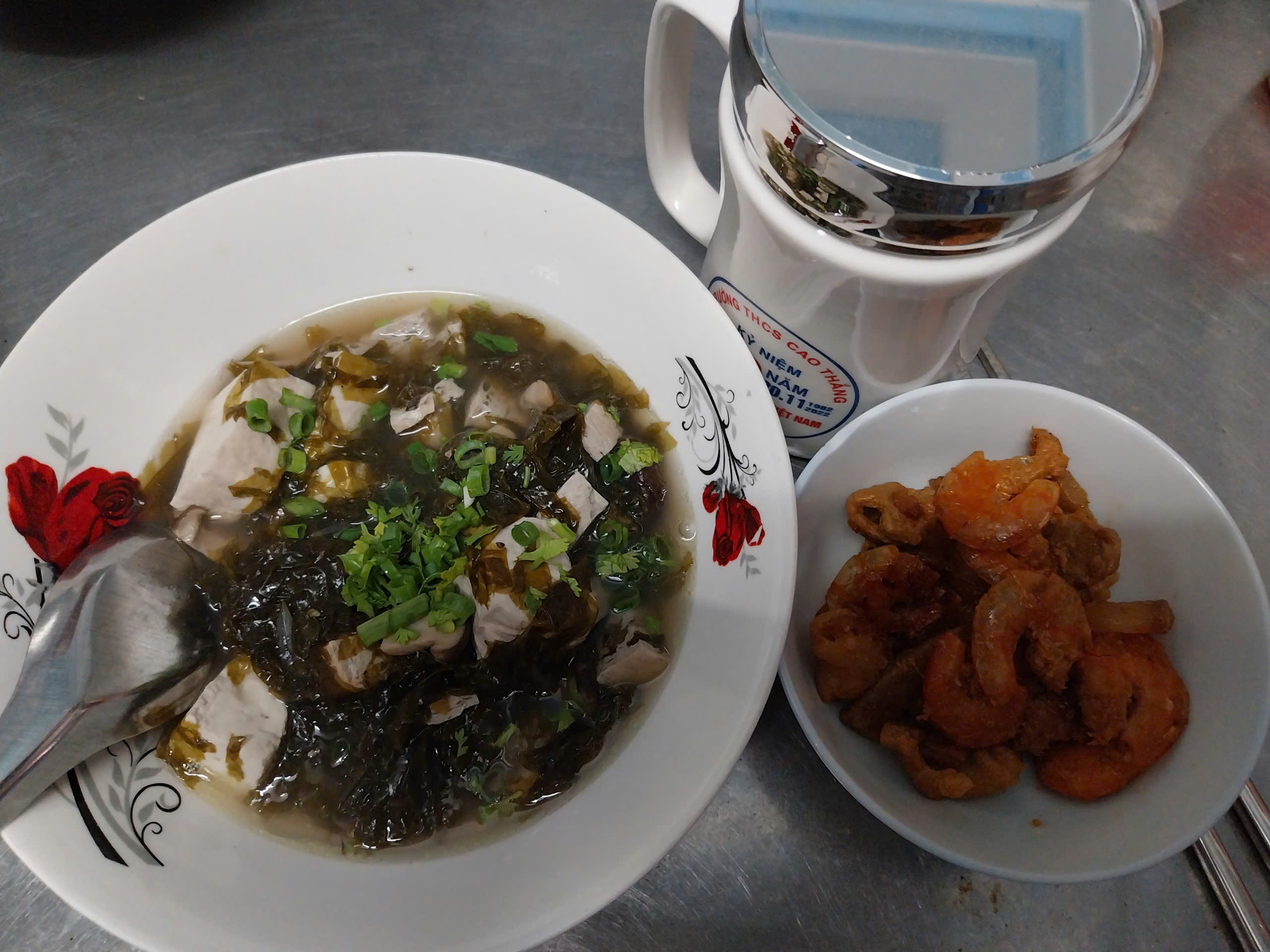 1) Canh cải thảo với tép bóc vỏ, hành lá, rau mùi, hạt tiêu, và một chút muối.