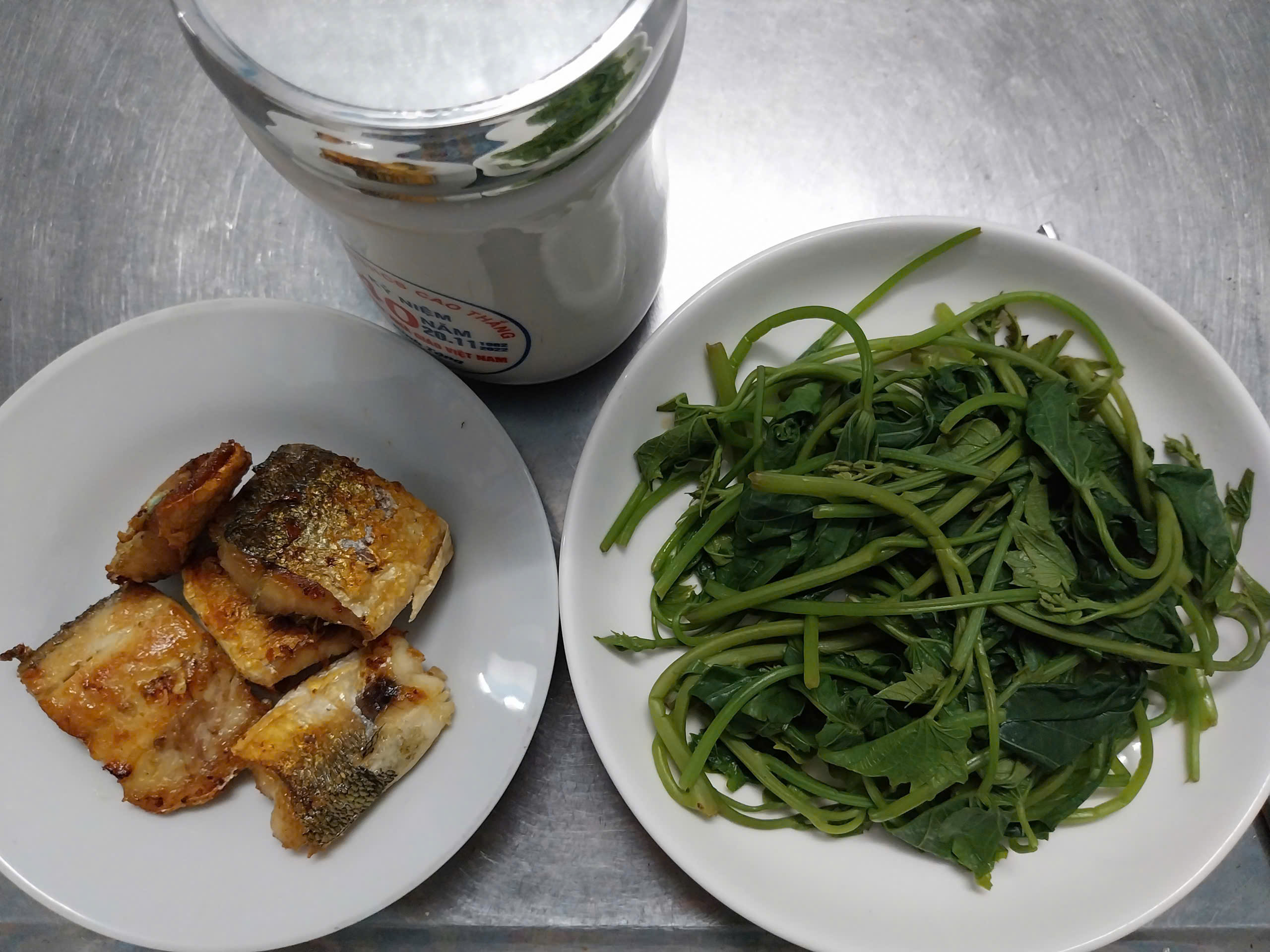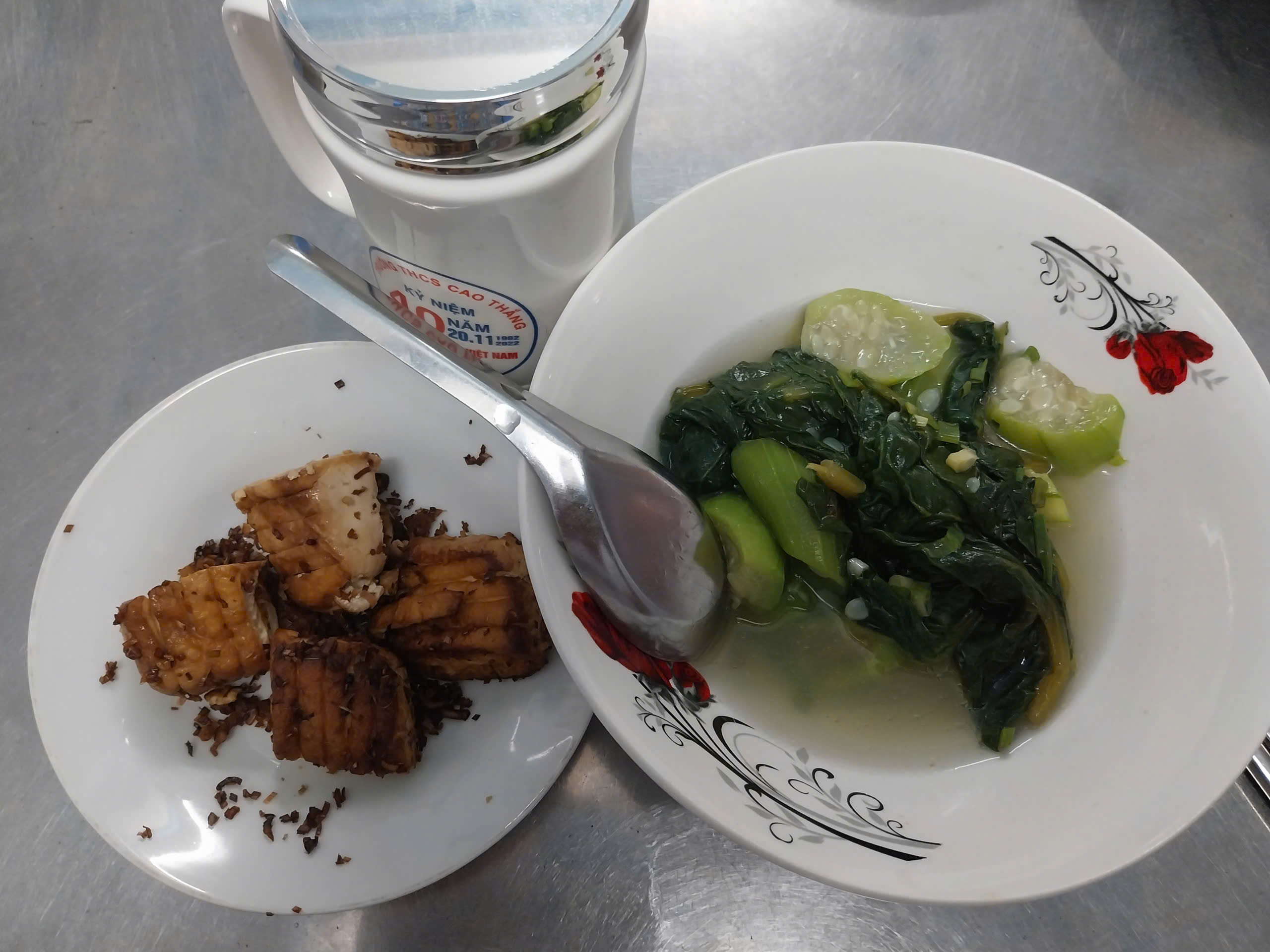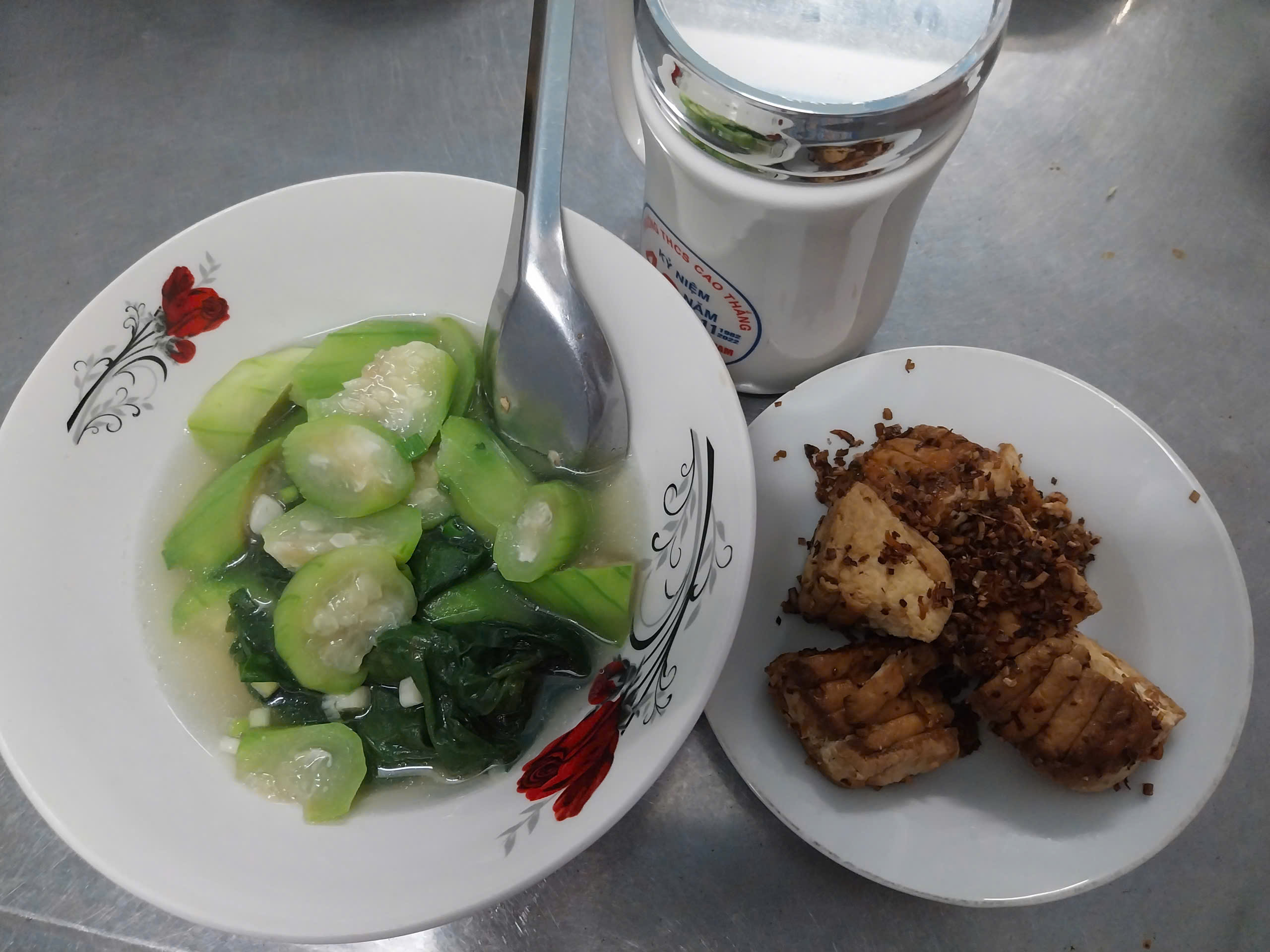 1) Canh mướp và rau mồng tơi với một chút hành lá.