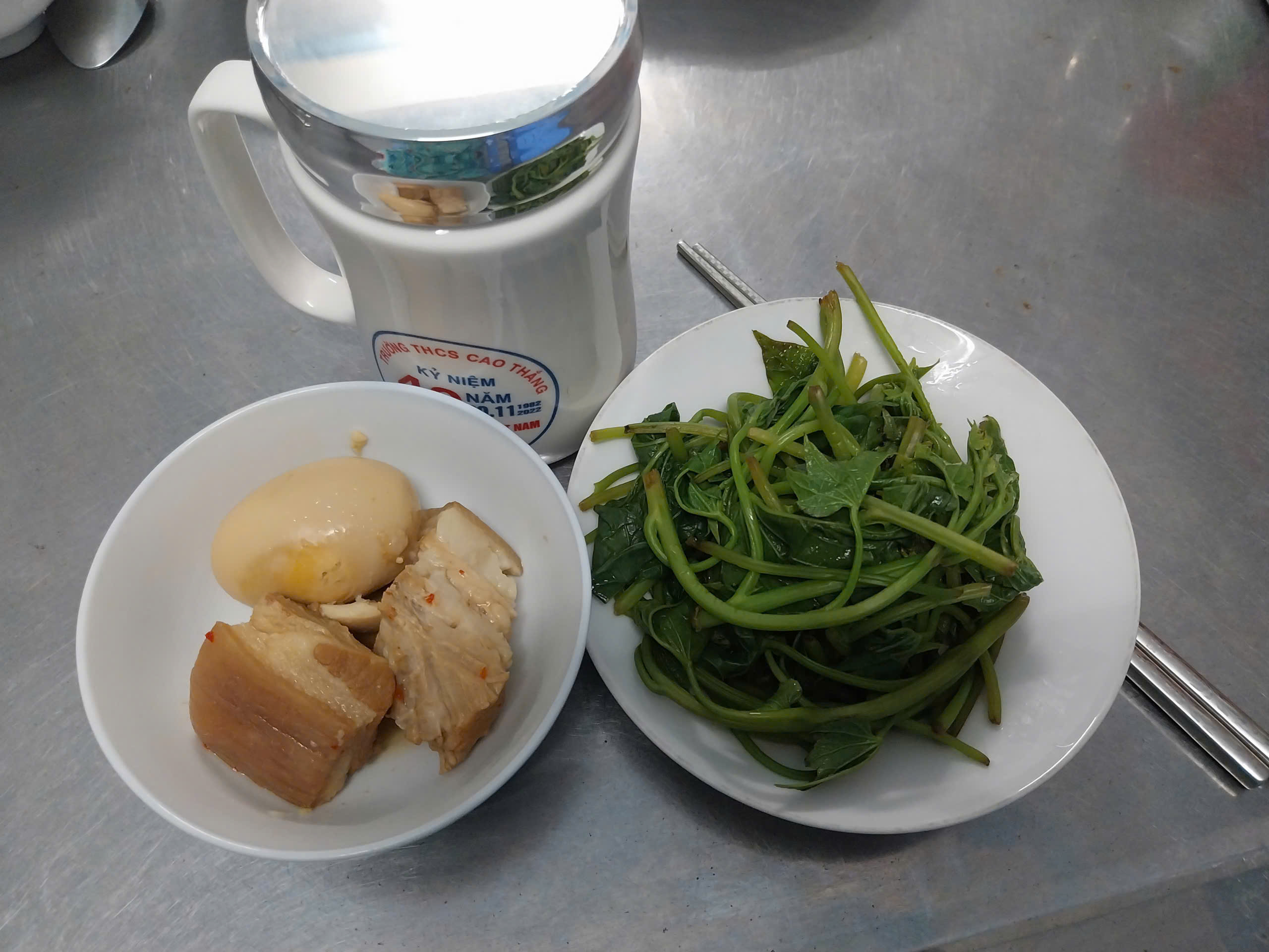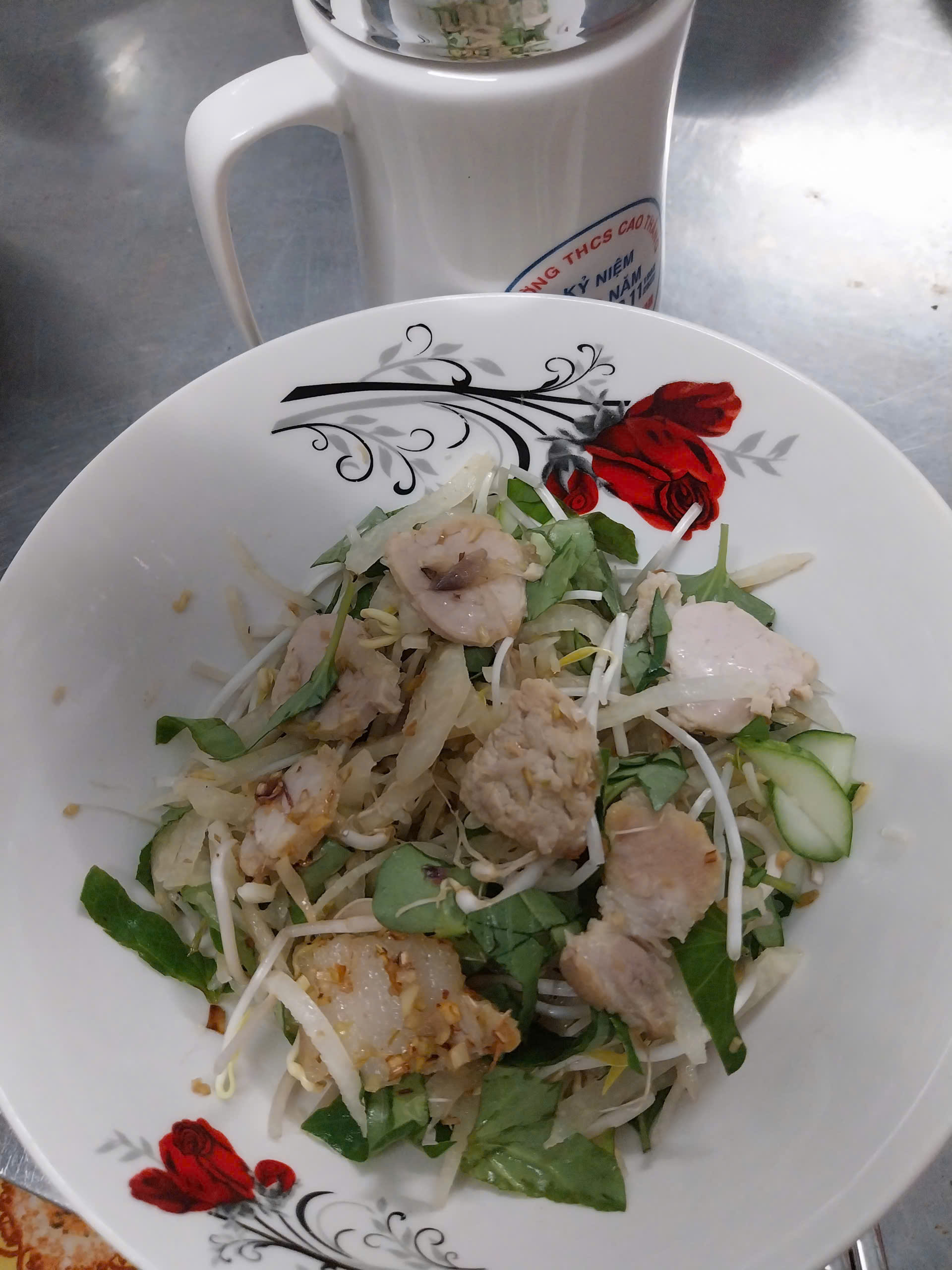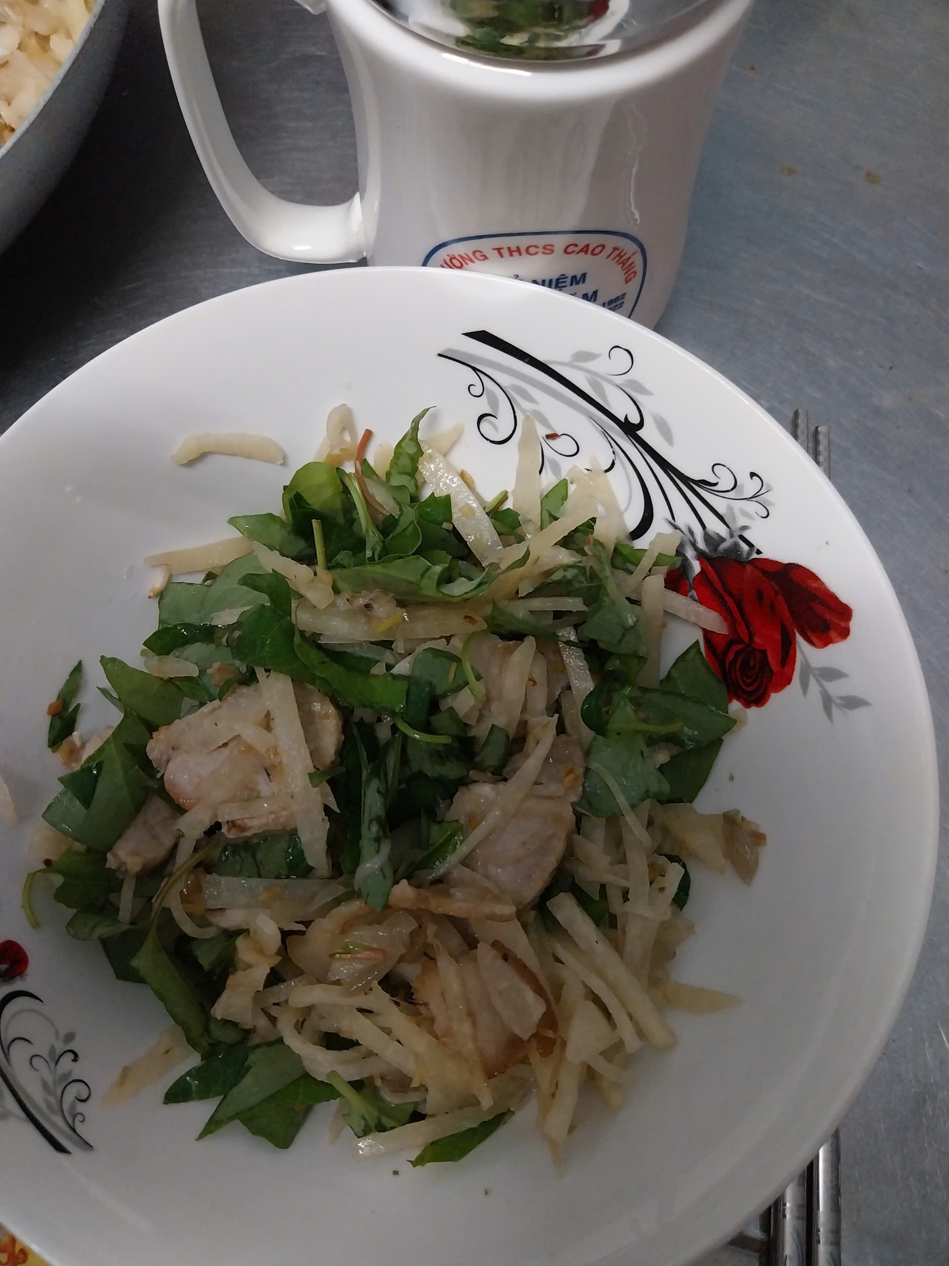 Thịt ba rọi xào với sả, củ sắn (củ đậu miền Bắc), ăn kèm rau thơm, rau diếp cá. Xào với mỡ heo và một chút muối.