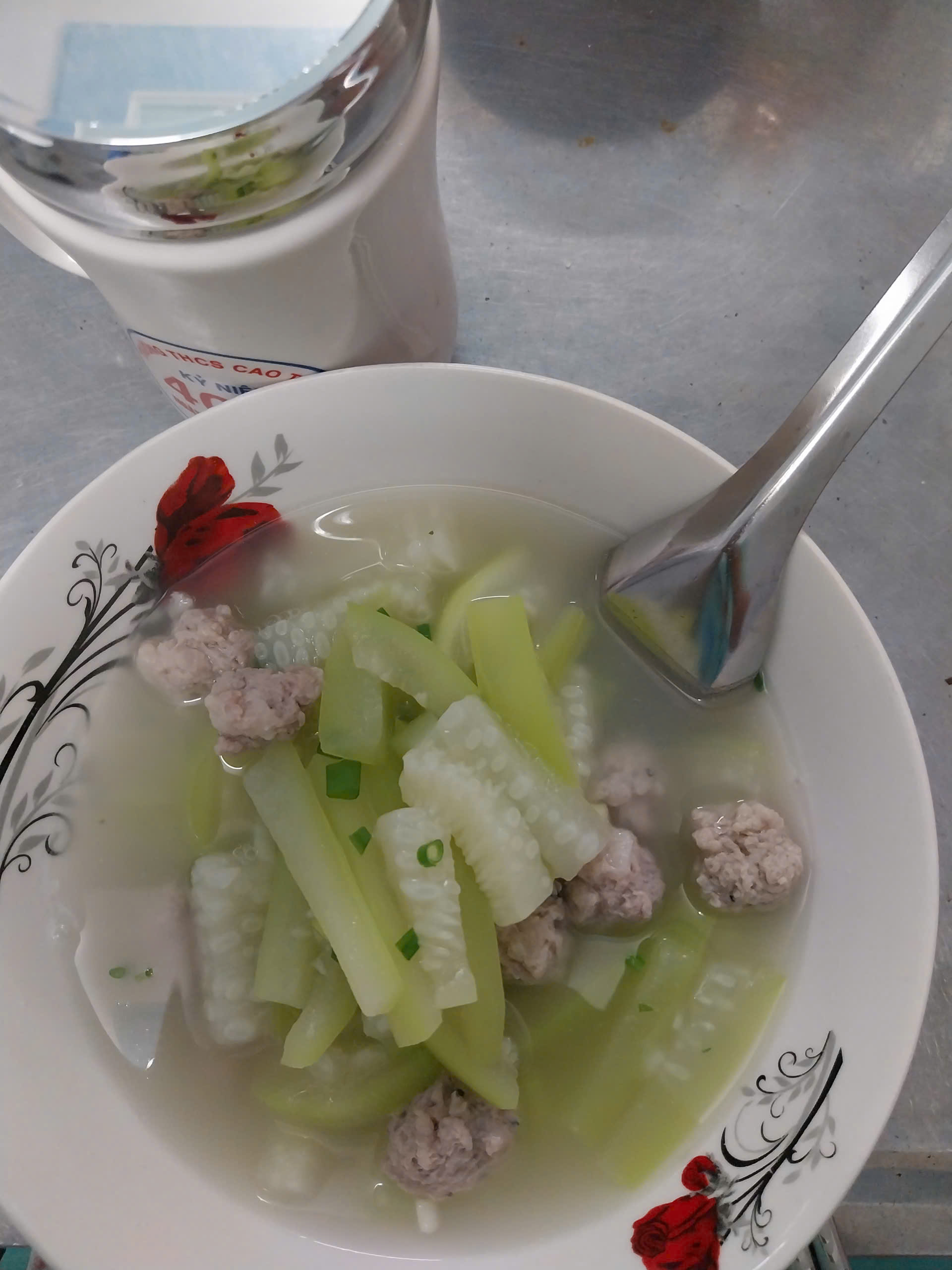 Canh bầu nấu với thịt heo băm, thêm chút hành lá.