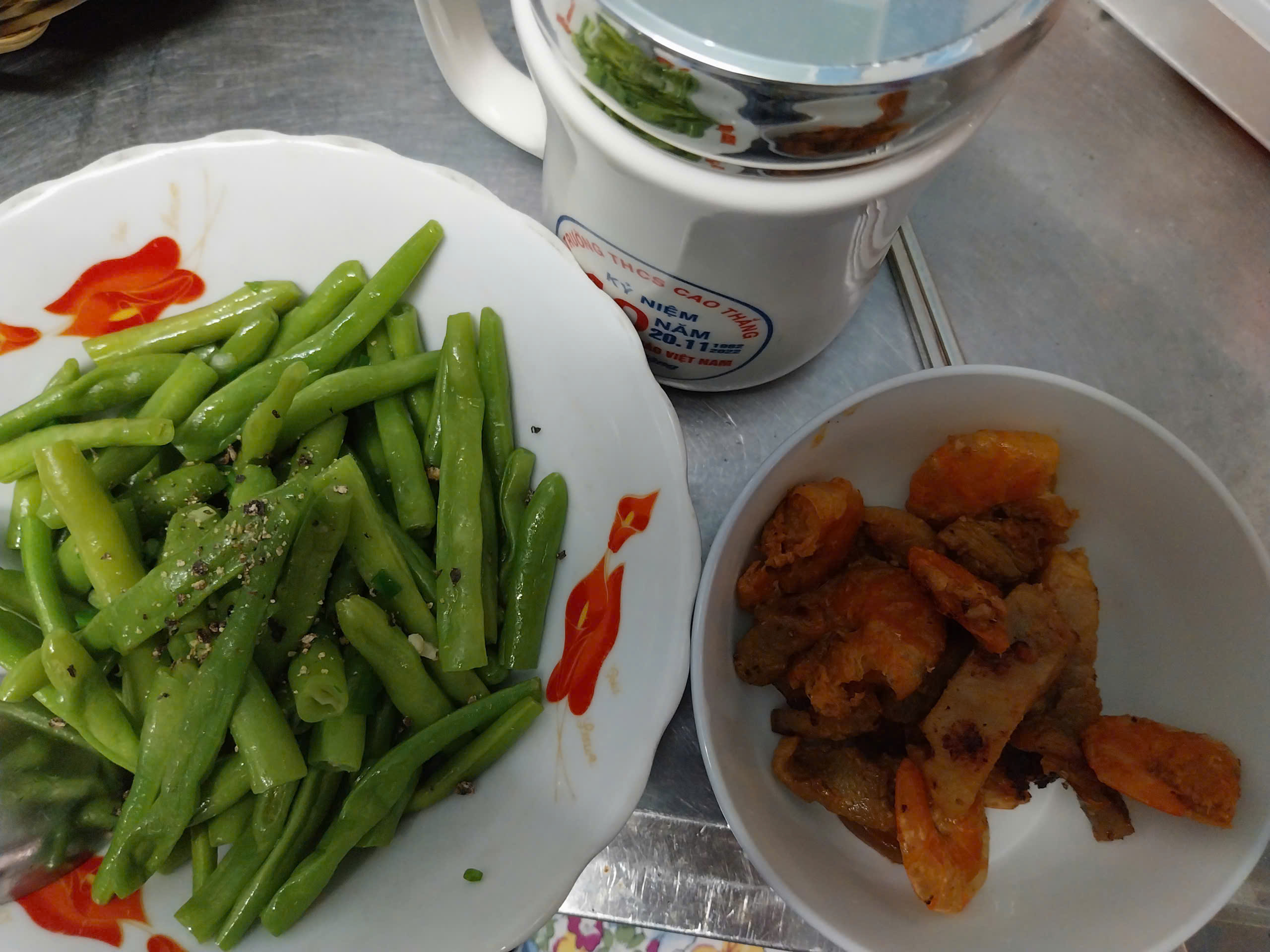 1) Đậu que xào mỡ, thêm hành lá và tiêu.