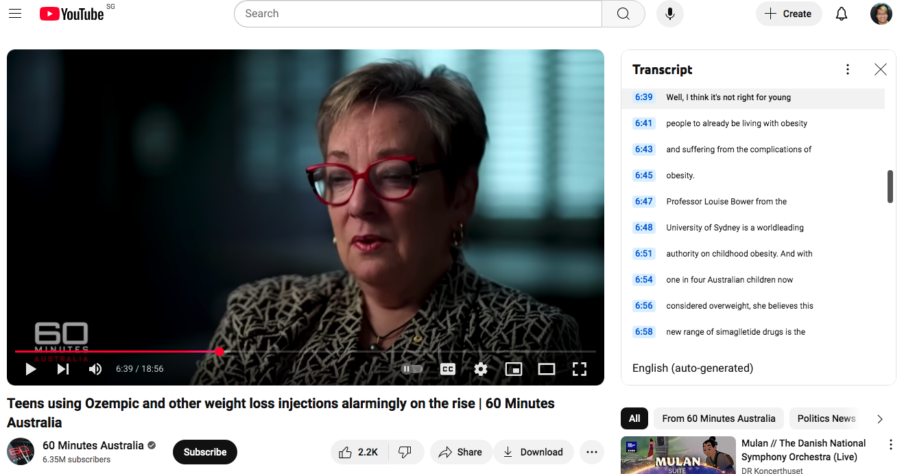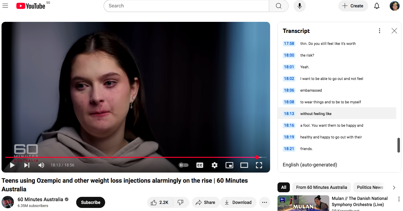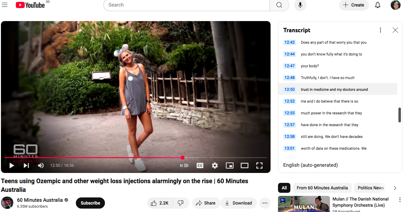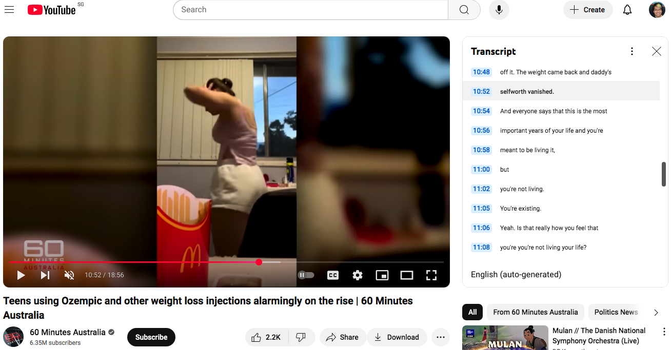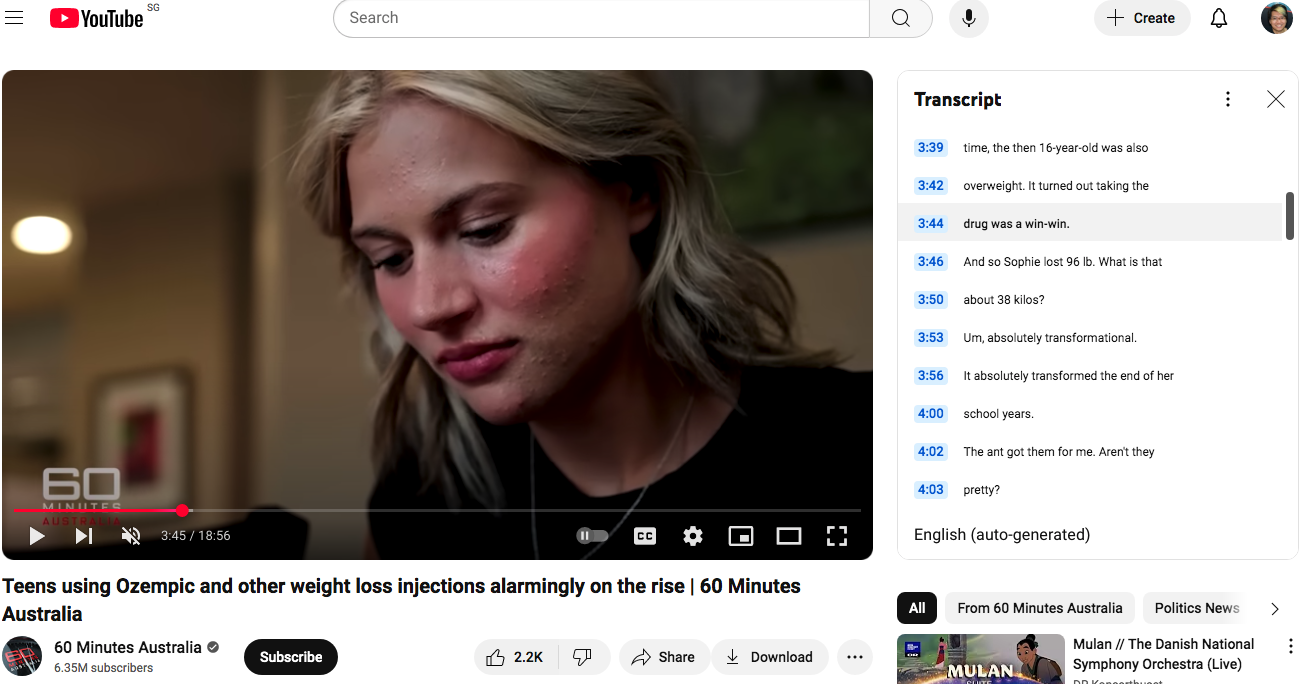 Video thảo luận về việc sử dụng các loại thuốc giảm cân mới như Ozempic và cách chúng trở nên phổ biến, đặc biệt là ở thanh thiếu niên. Tại Úc, trẻ em từ 12 tuổi trở lên hiện có thể mua những loại thuốc này theo đơn.