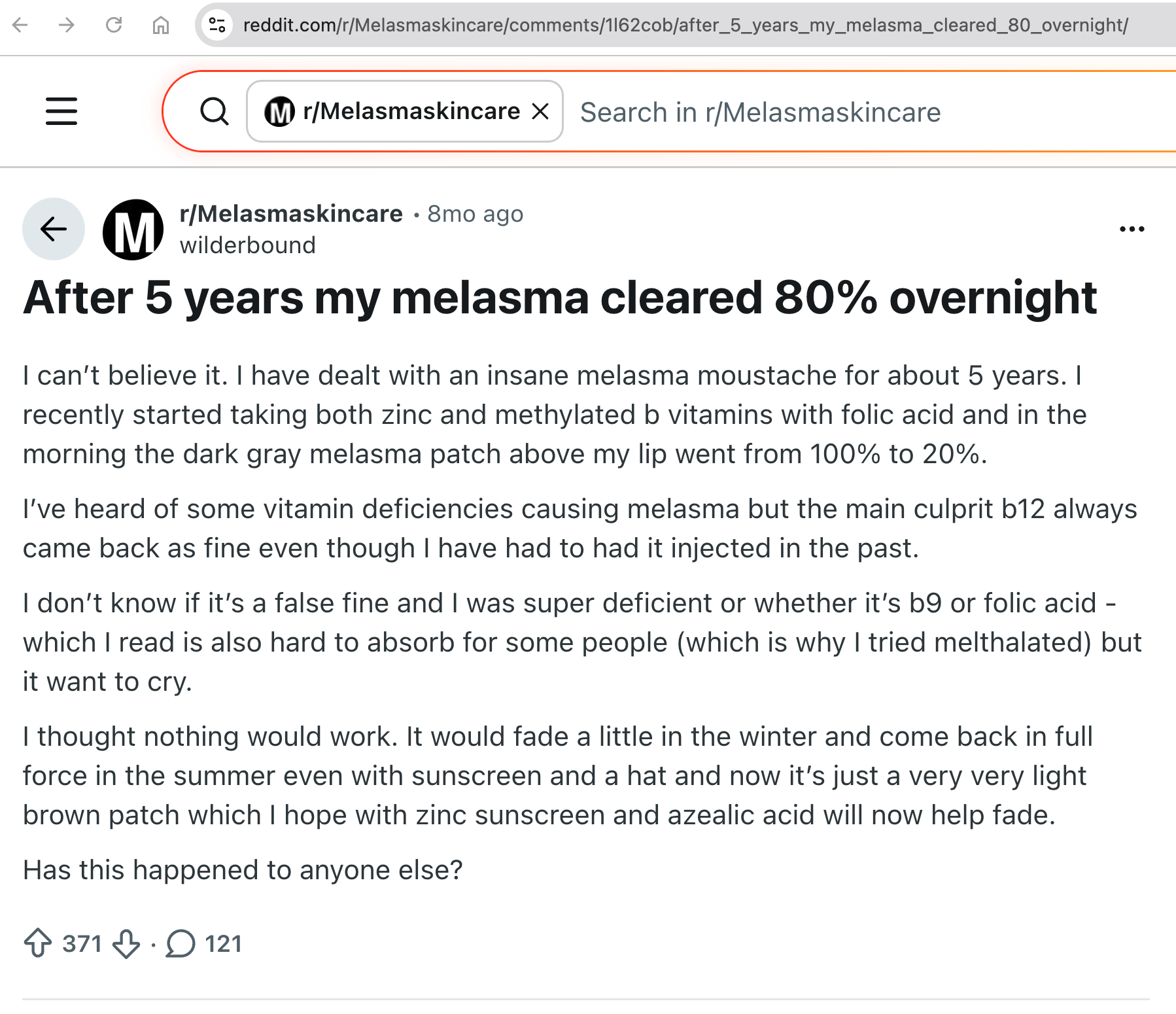 Nguồn ảnh: https://www.reddit.com/r/Melasmaskincare/comments/1l62cob/after_5_years_my_melasma_cleared_80_overnight/